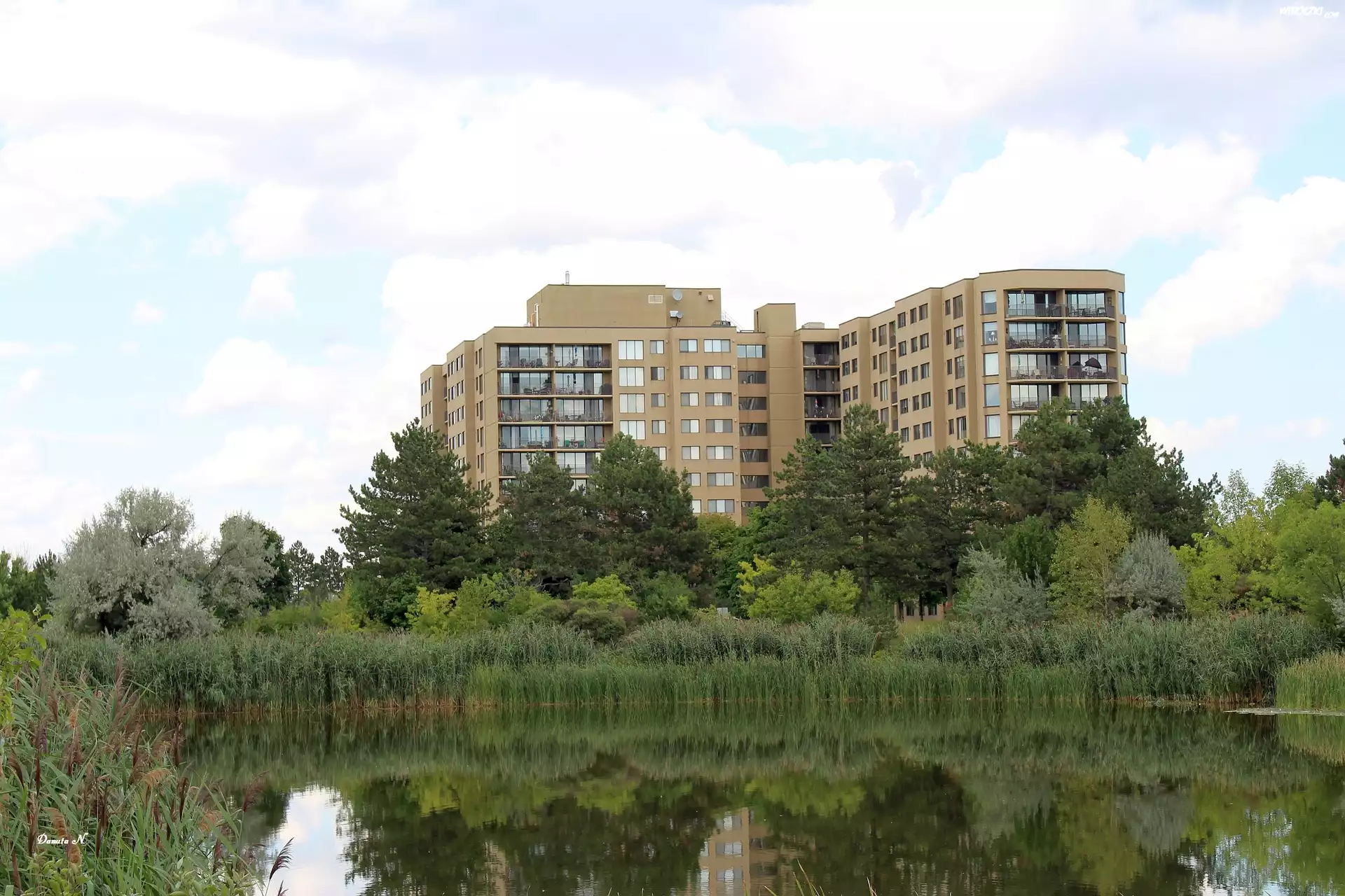 Zdjęcia, Staw, Drzewa, Zarośla, Odbicie w Wodzie, Budynek