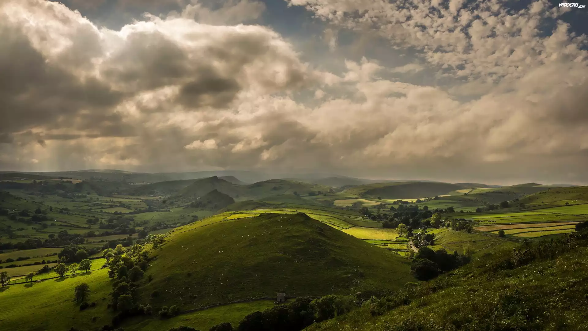 Zdjęcia, Wzgórza, Pola, Wieś Earl Sterndale, Hrabstwo Derbyshire, Anglia, Chmury, Drzewa