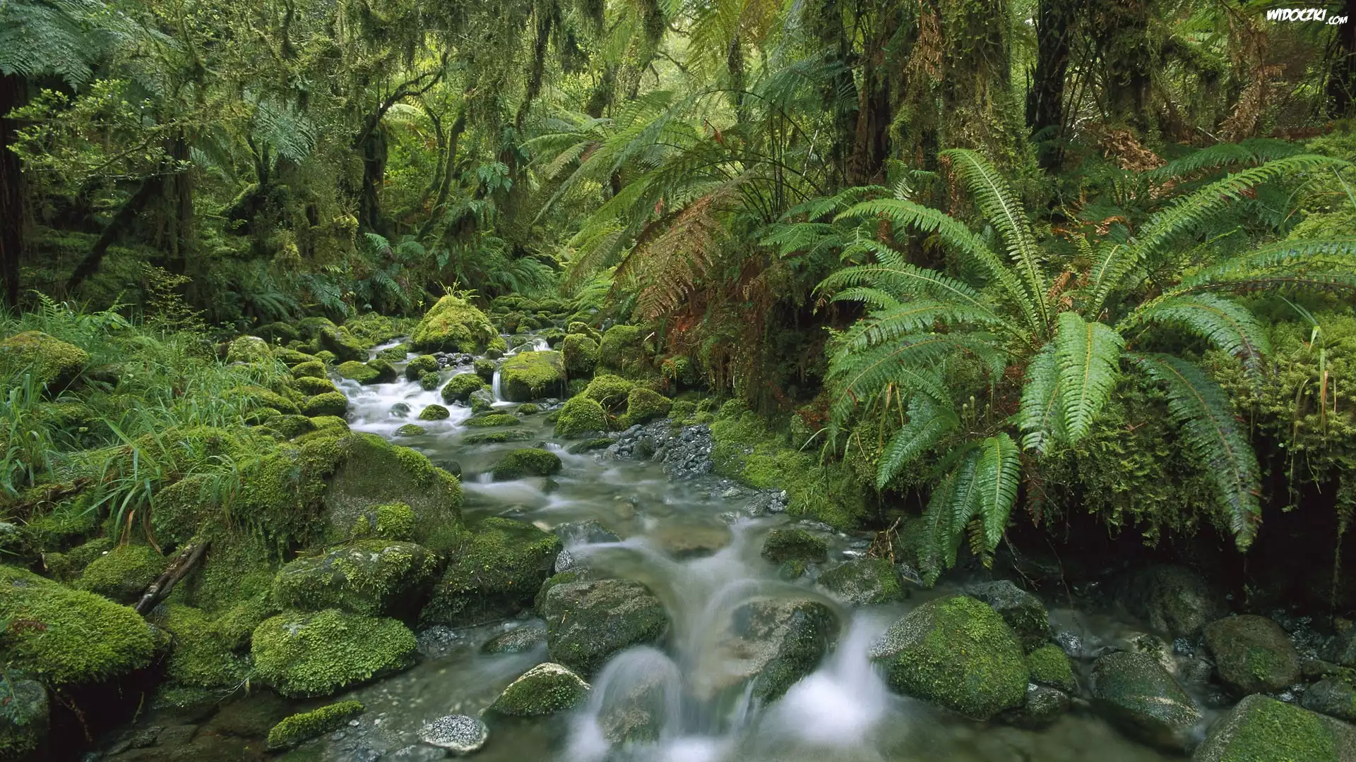 Zdjęcia, Drzewa, Paprocie, Strumyk, Kamienie