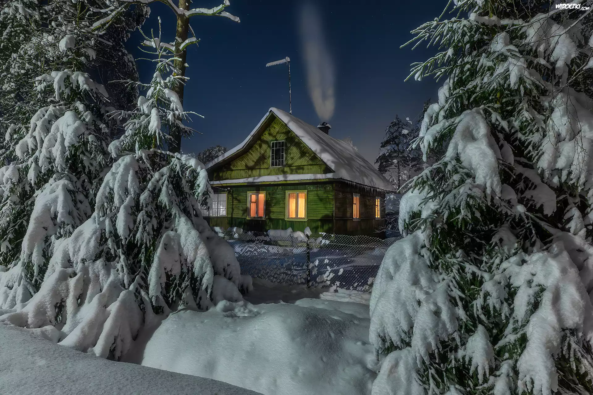 Zdjęcia, Zima, Dom, Światła, Śnieg, Zaspy, Noc, Gwiazdy, Drzewa