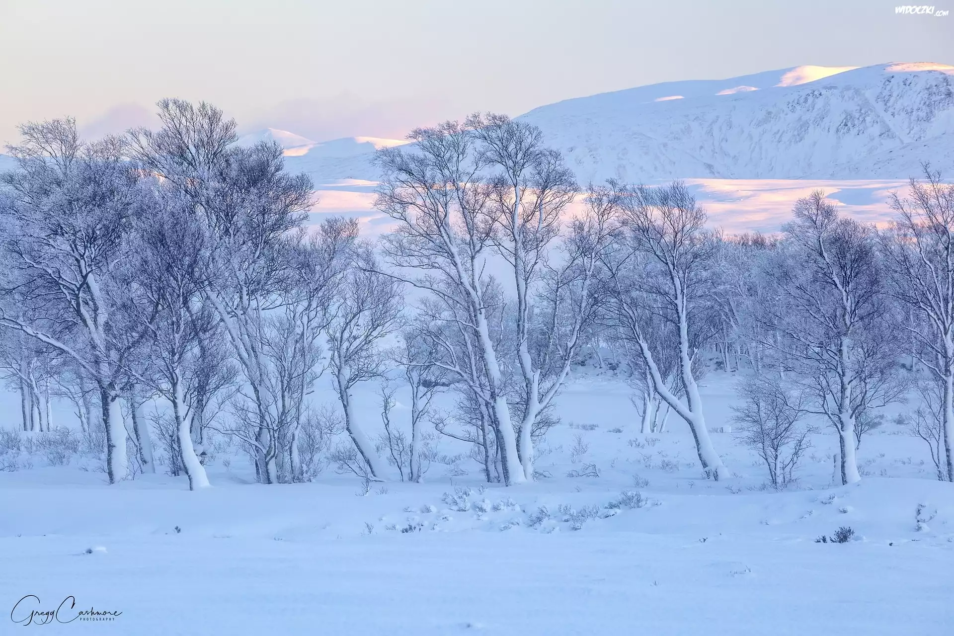 Zdjęcia, Zima, Drzewa, Góry Rannoch Moor, Wieś Glencoe, Szkocja