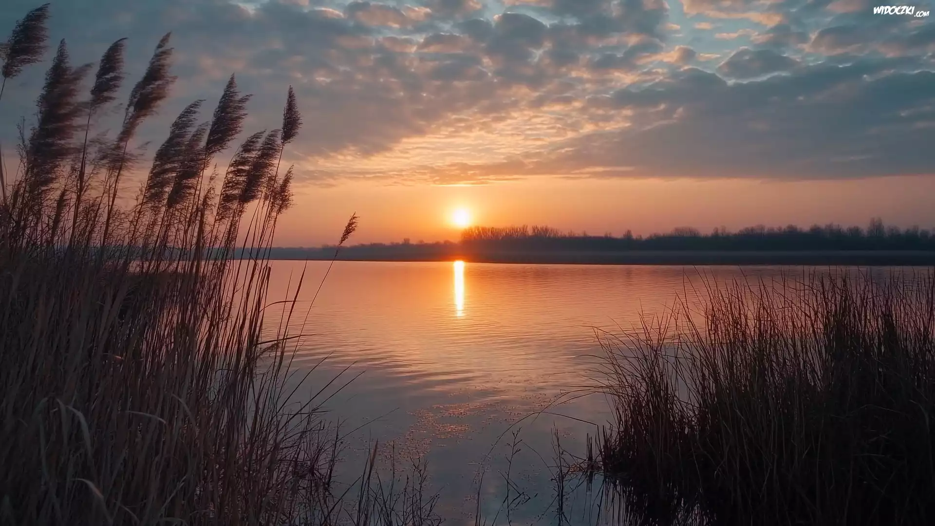 Zdjęcia, Jezioro, Trawa, Szuwary, Drzewa, Niebo, Zachód słońca
