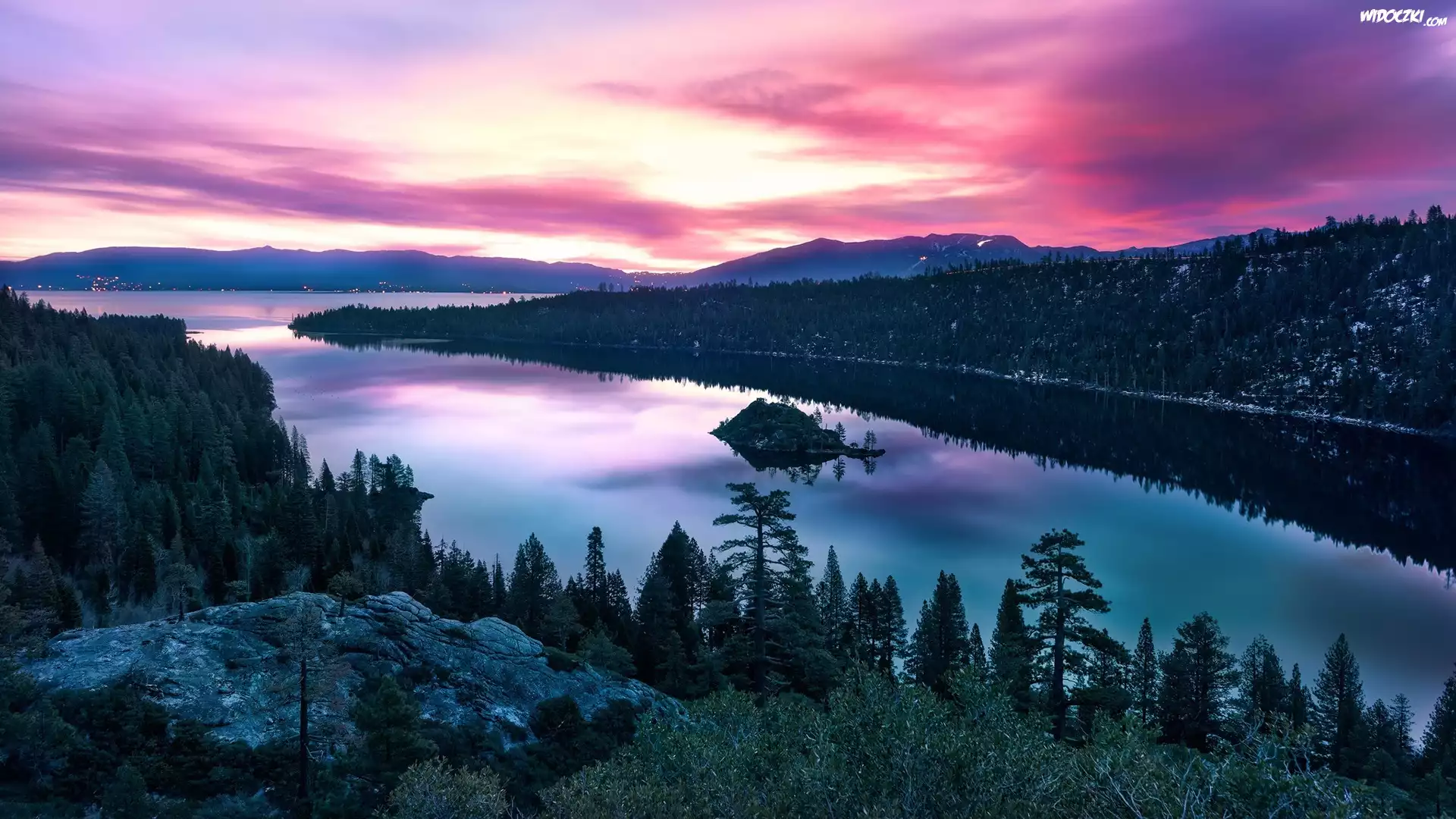Stany Zjednoczone, Kalifornia, Jezioro, Tahoe Lake, Wyspa Fannette, Drzewa, Góry, Drzewa, Niebo, Zachód słońca |
