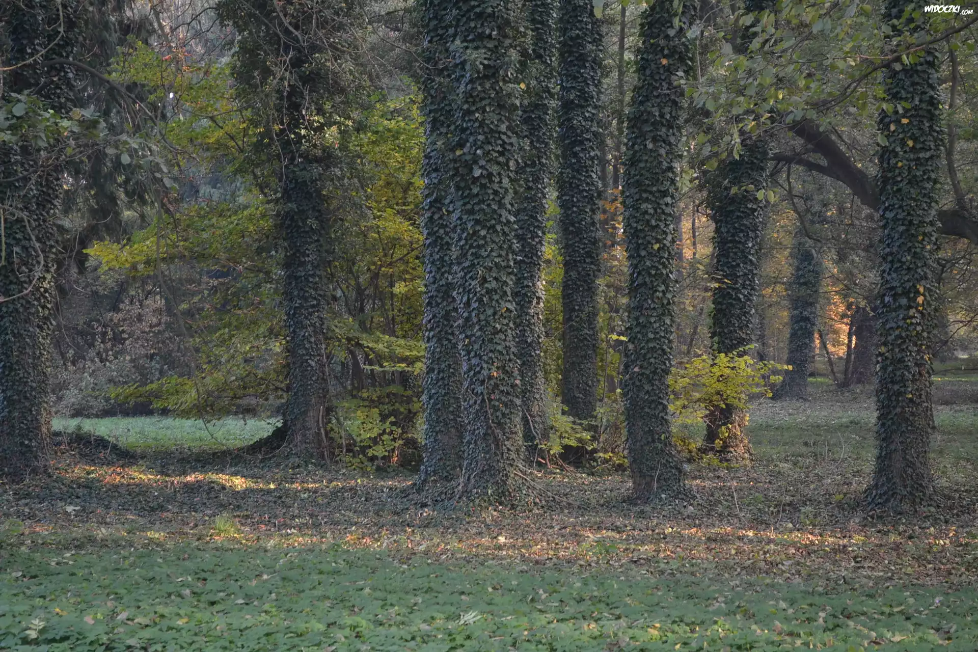 Drzewa, Porośnięte, Bluszczem, Trawa, Liście