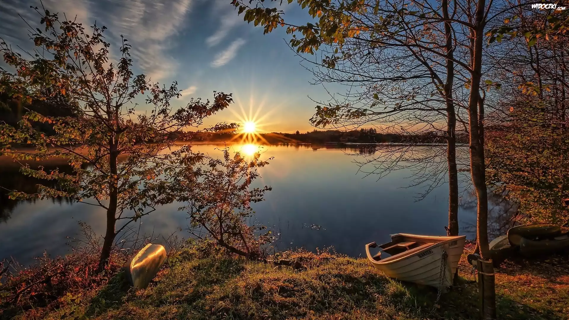 Zdjęcia, Norwegia, Okręg Rogaland, Jezioro Vormedalsvatnet, Wschód Słońca, Łódka, Jesień, Drzewa