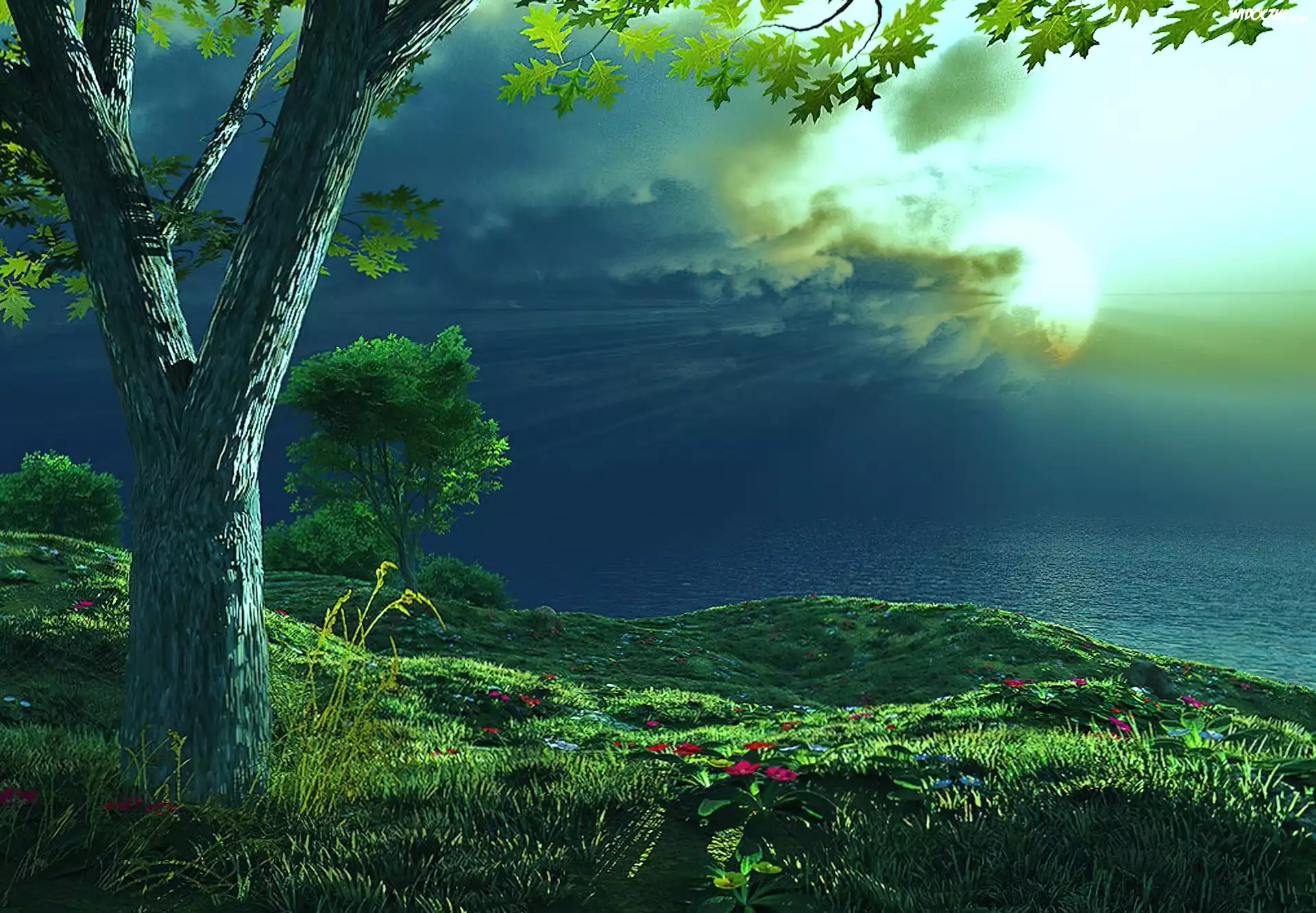Drzewa, Morze, Słońce, W, Chmurach