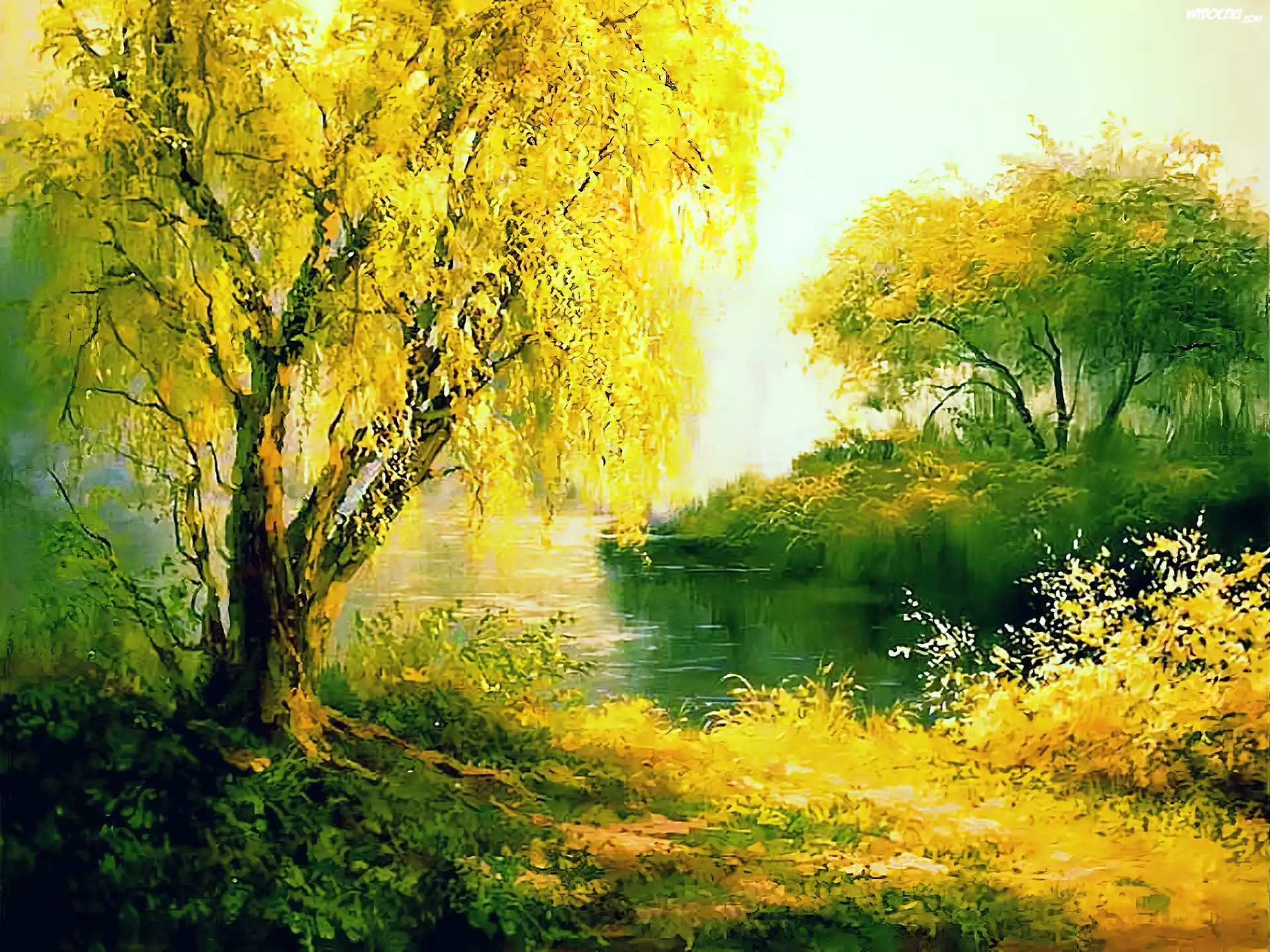 Drzewa, Staw, Jesień, Widoczek, Malarstwo