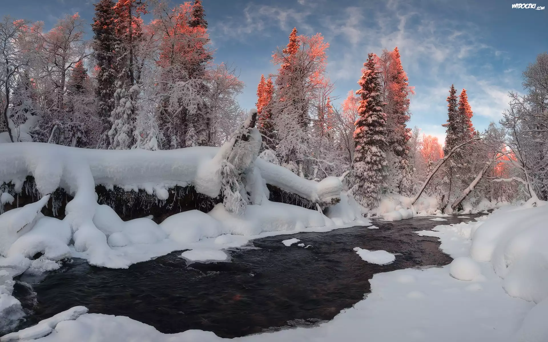 Zima, Rzeka, Ośnieżone, Drzewa, Rozświetlone, Wierzchołki