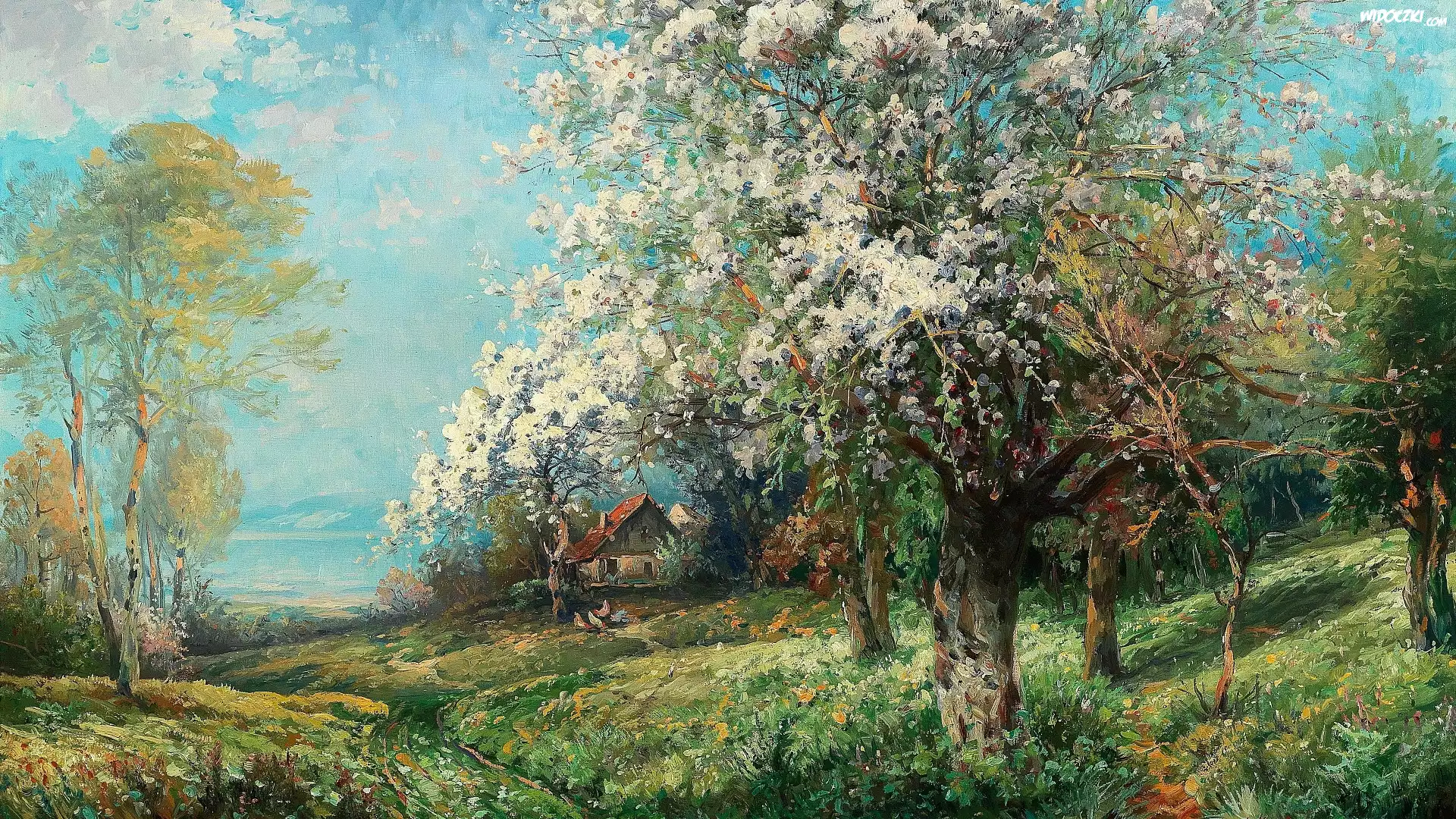 Zdjęcia, Malarstwo, Obraz, Adolf Kaufmann, Wieś, Wiosna, Domek, Kury, Kwitnące, Drzewa