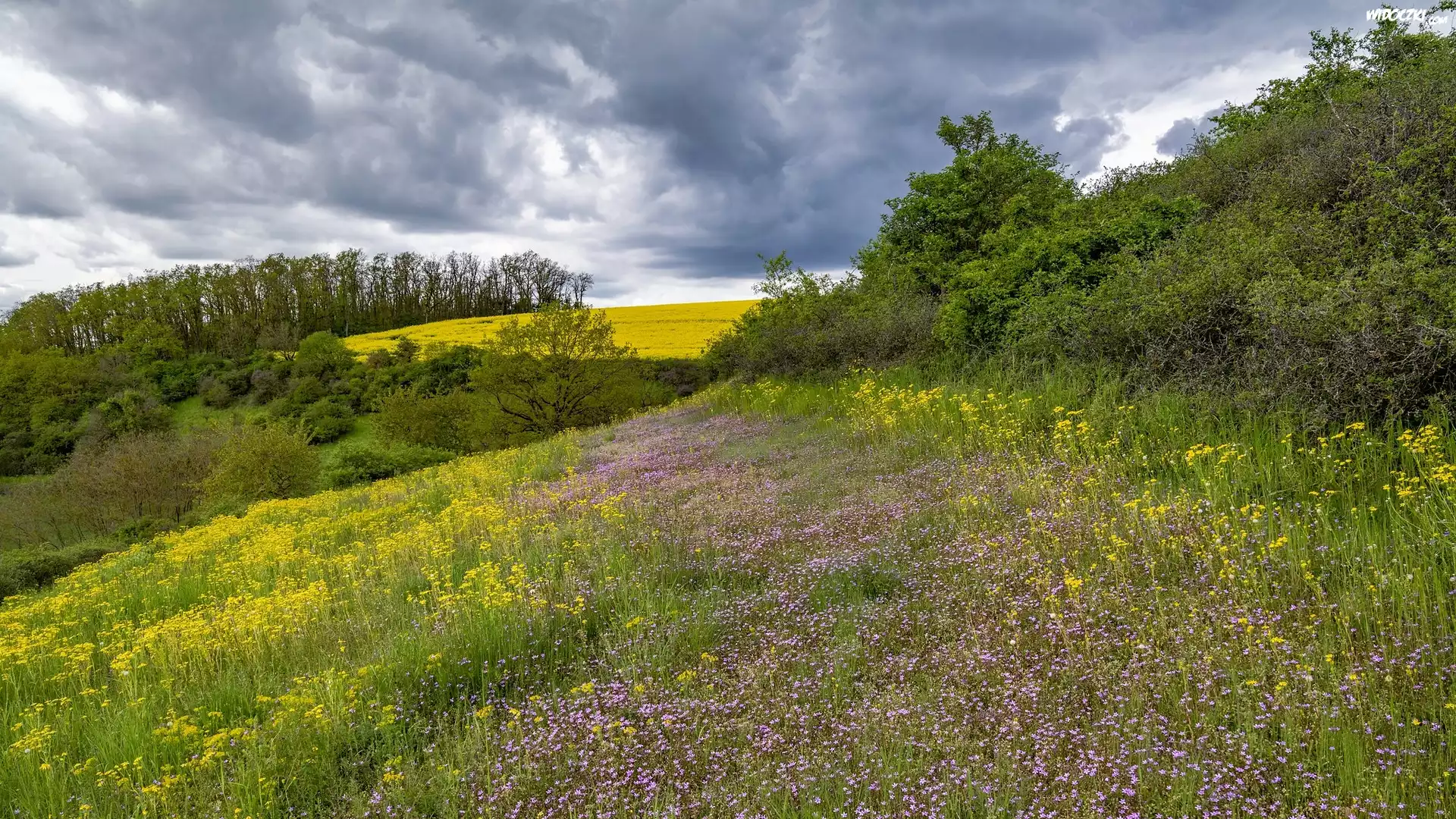 Zdjęcia, Wiosna, Łąka, Kwiaty, Drzewa
