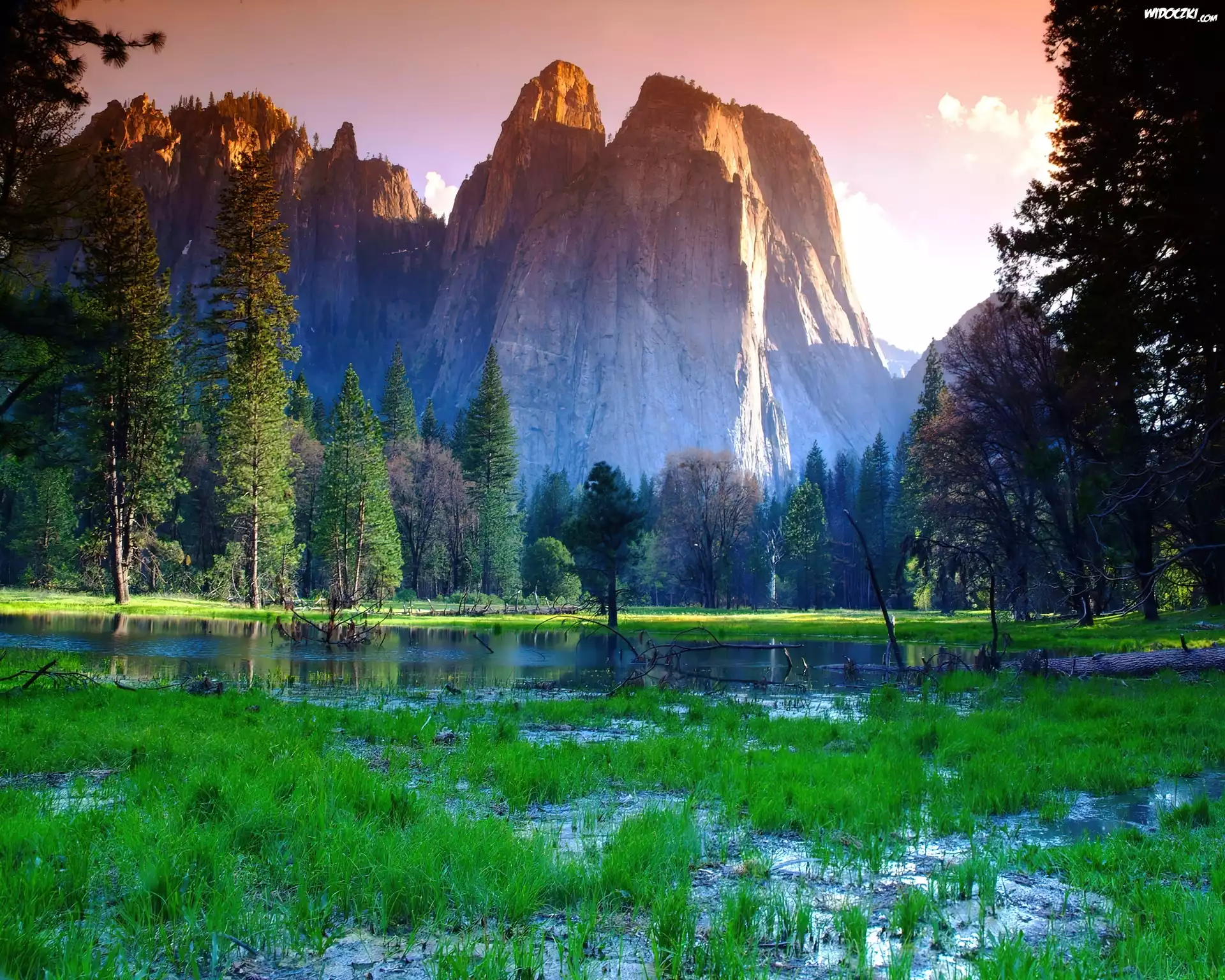 Zdjęcia, Stany Zjednoczone, Stan Kalifornia, Park Narodowy Yosemite, Łąka, Woda, Góry, Drzewa