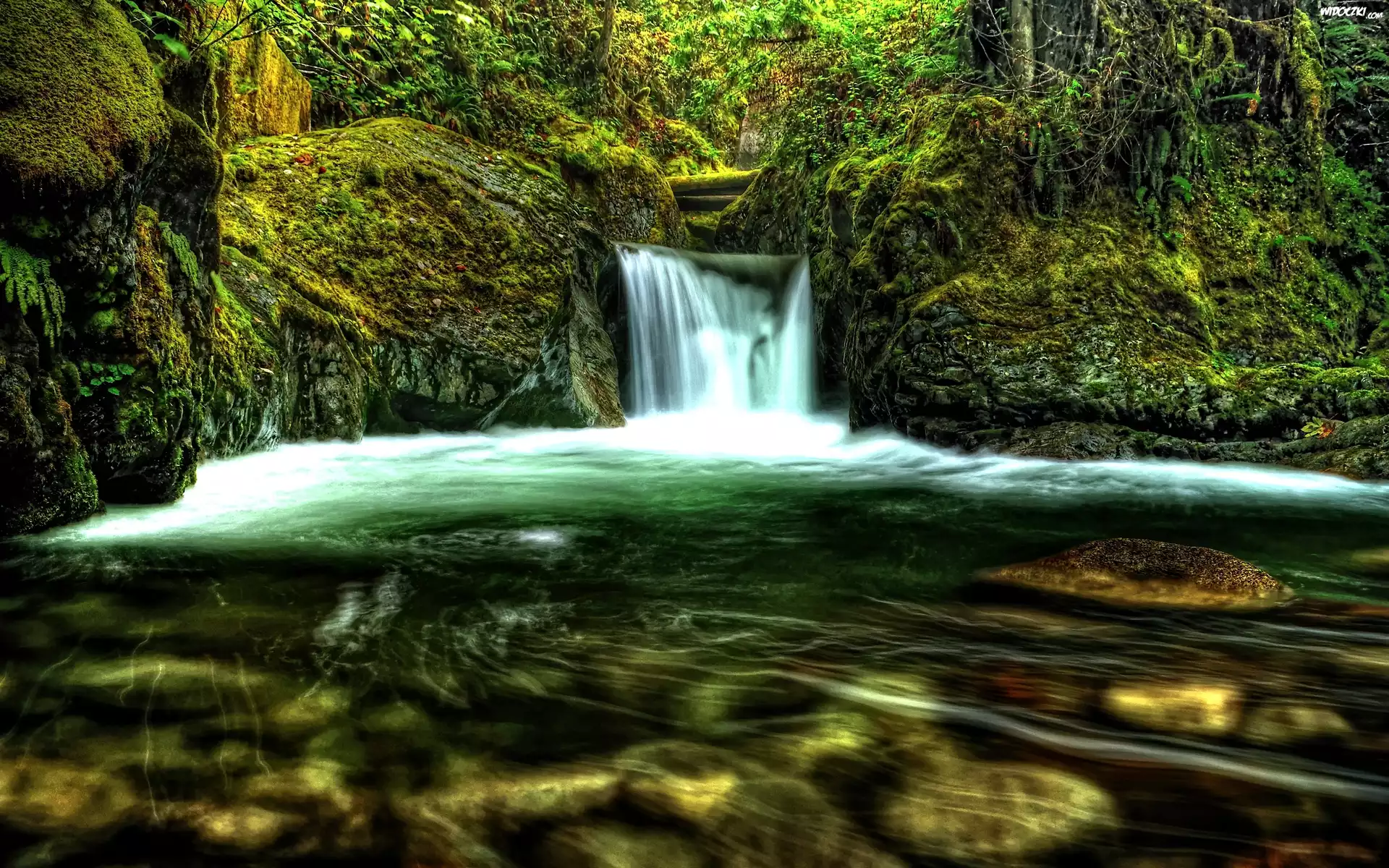 Zdj臋cia, Wodospad, Drzewa, Mech