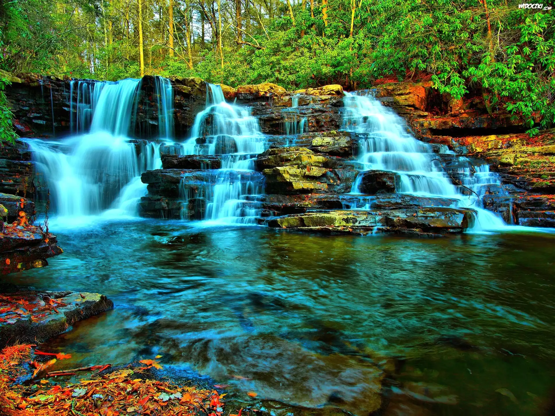 Zdjęcia, Drzewa, Skały, Wodospad, Jeziorko