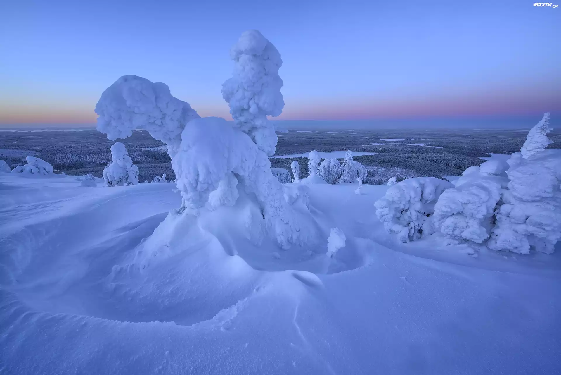 Zdjęcia,  Zima, Drzewa, Mgła, Wschód słońca, Wzgórze, Rezerwat Valtavaara, Laponia, Finlandia