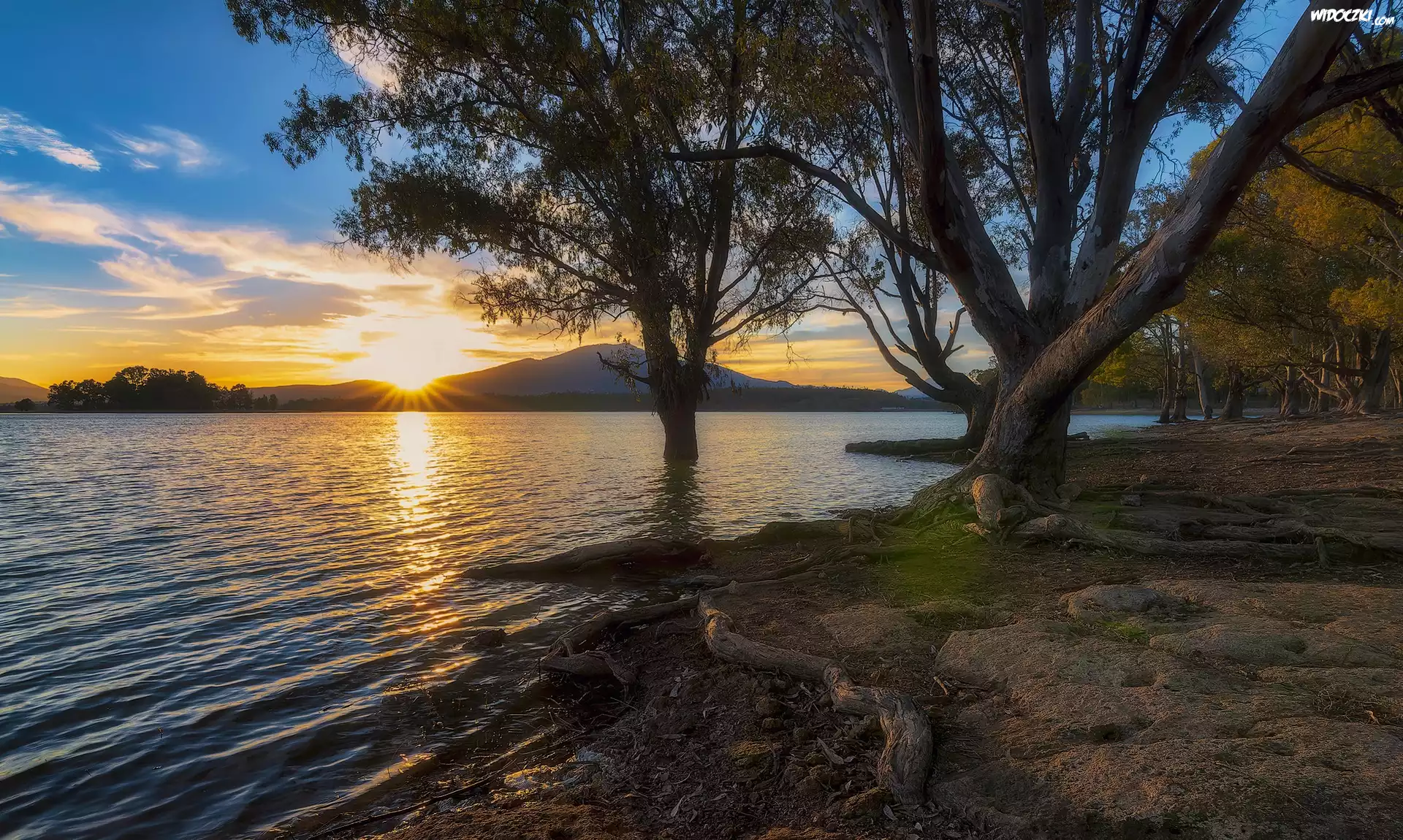 Jezioro, Drzewa, Wschód słońca, Góry