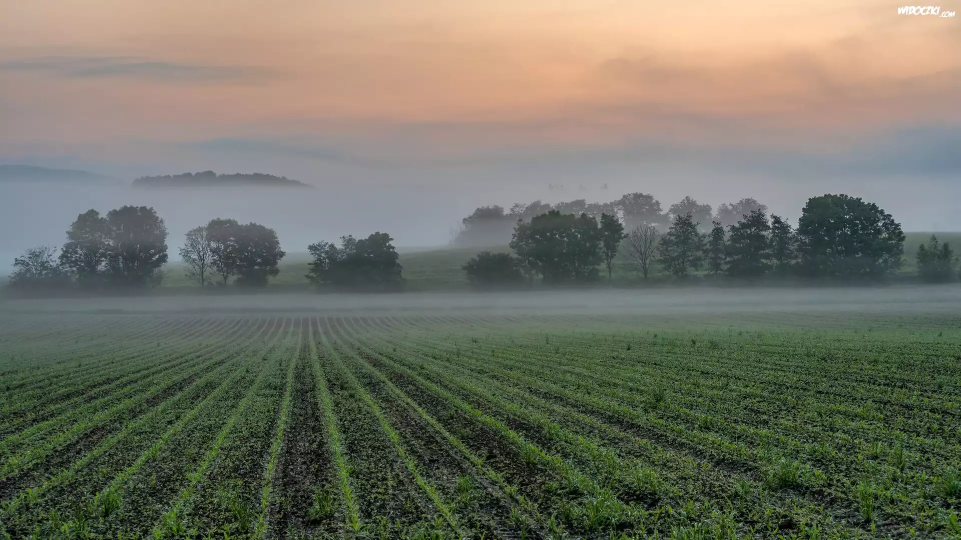 Pole, Drzewa, Wschód słońca, Mgła