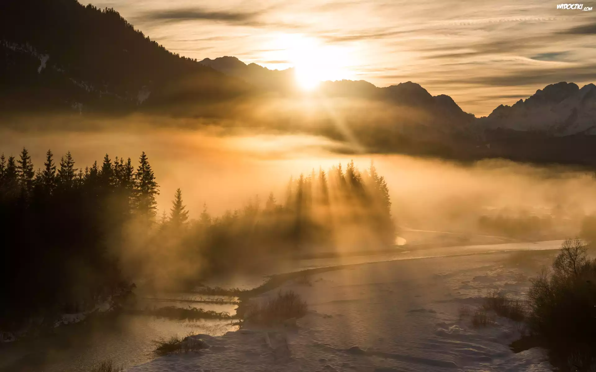 Drzewa, Śnieg, Góry, Mgła, Rzeka, Poranek, Wschód słońca, Zima