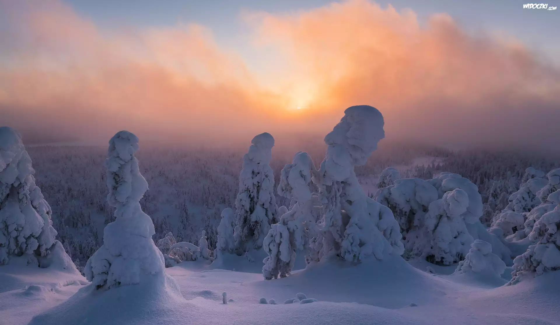 Zdjęcia, Zima, Zaśnieżone, Drzewa, Mgła, Wschód słońca, Rezerwat przyrody Valtavaara, Laponia, Finlandia