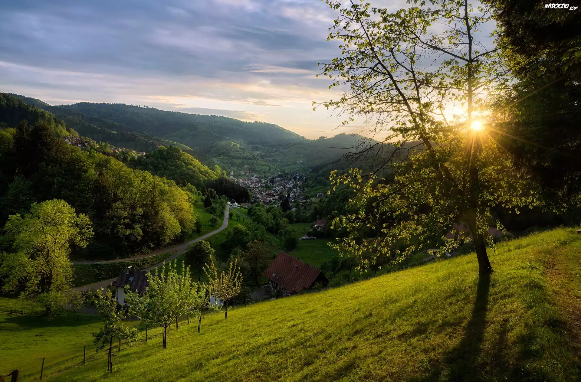 Wzgórza, Drzewa, Dolina, Domy, Droga, Promienie słońca