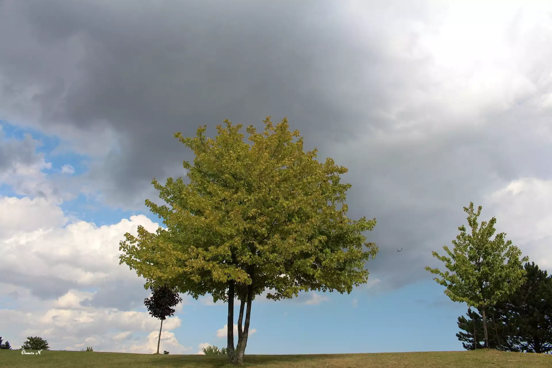 Drzewa, Zachmurzone, Niebo, Chmury, Wzgórze, Polana