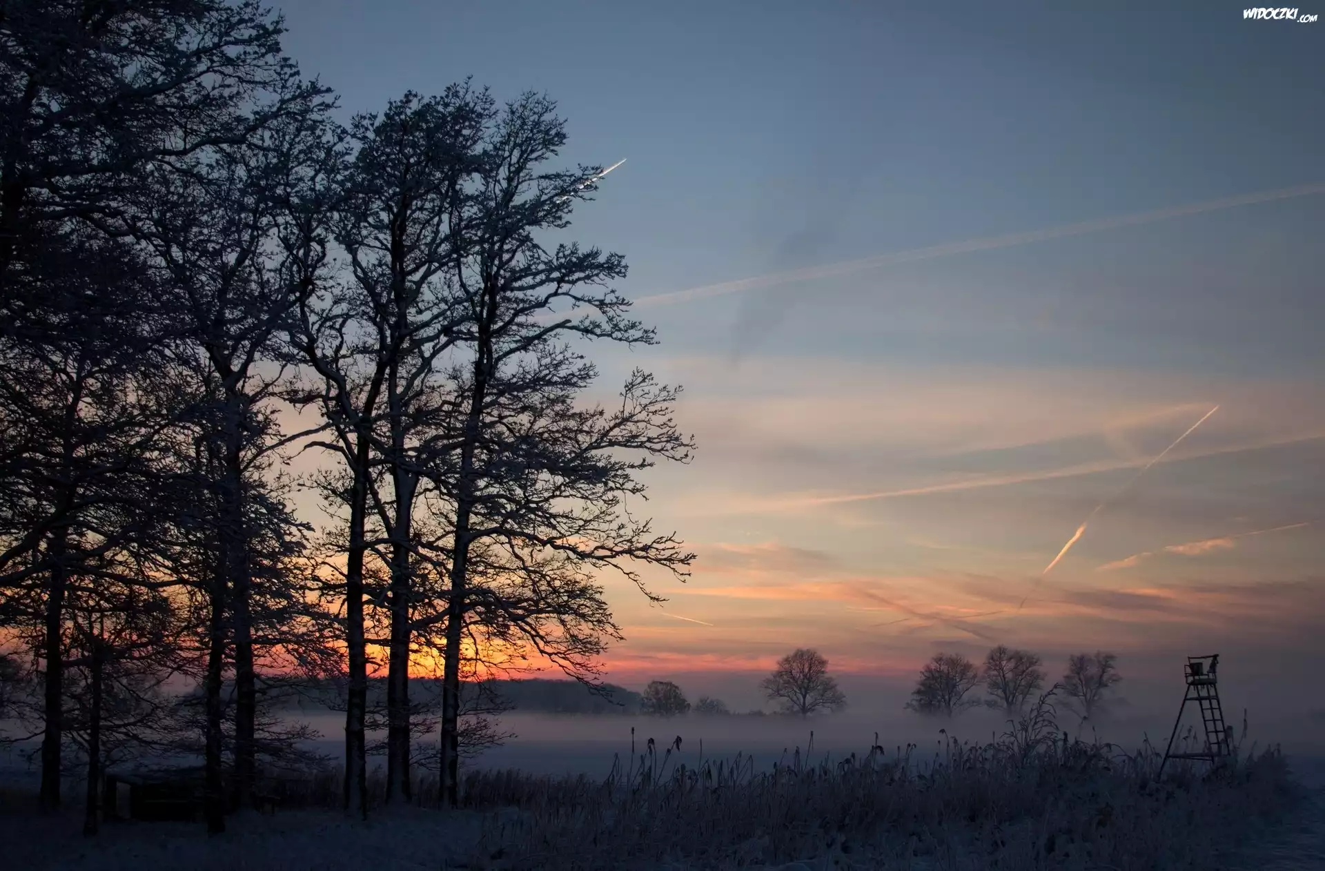 Drzewa, Trawa, Mgła, Zachód, Słońca