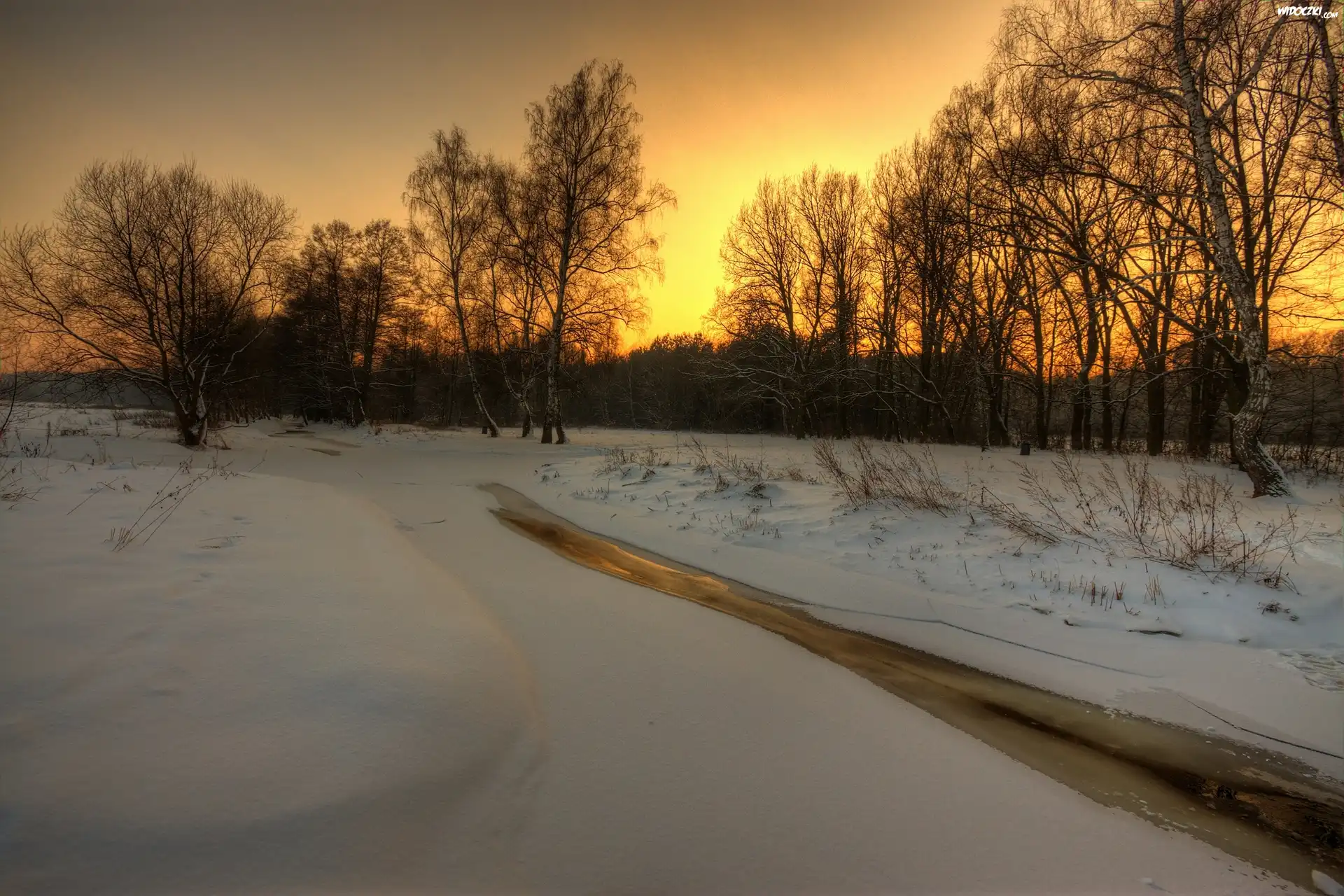 Zdjęcia, Drzewa, Potok, Zachód, Słońca