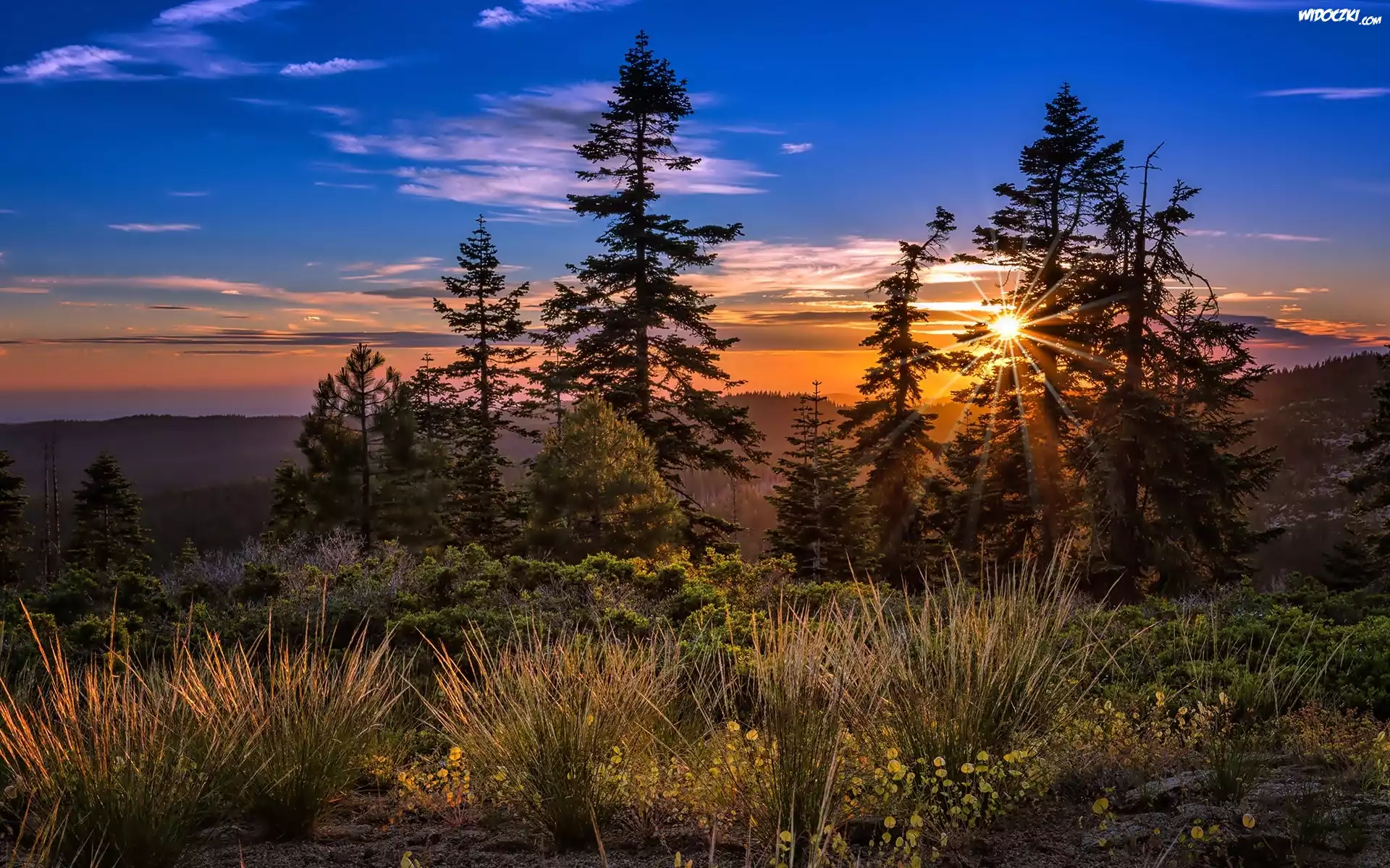 Zdjęcia, Drzewa, Krzewy, Promienie Słońca, Zachód słońca