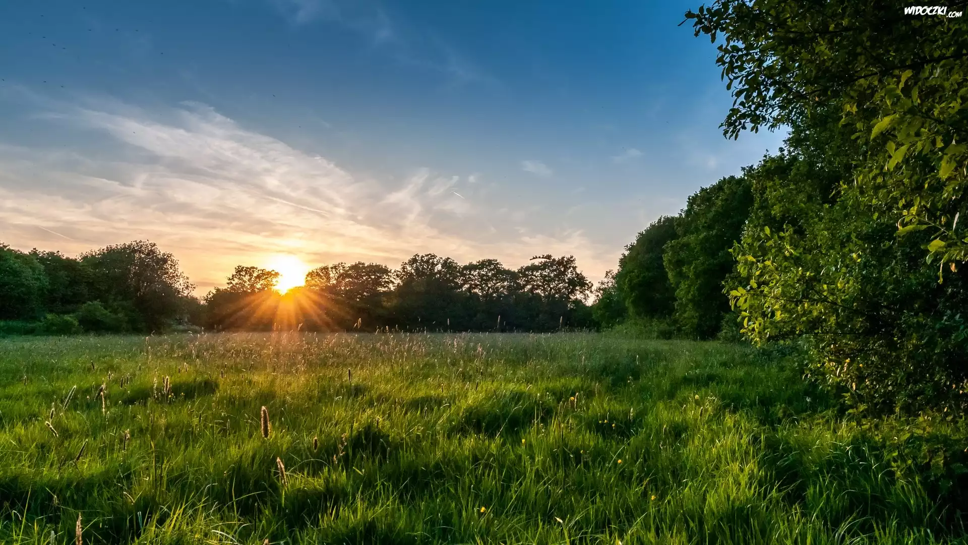 Zdjęcia, Łąka, Zachód słońca, Drzewa, Trawy