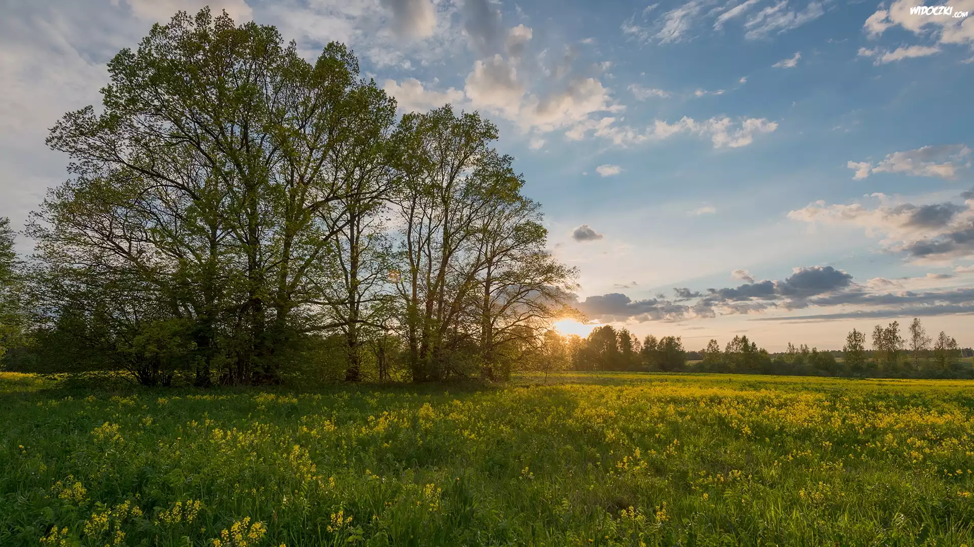 Drzewa, Łąka, Wiosna, Zachód słońca