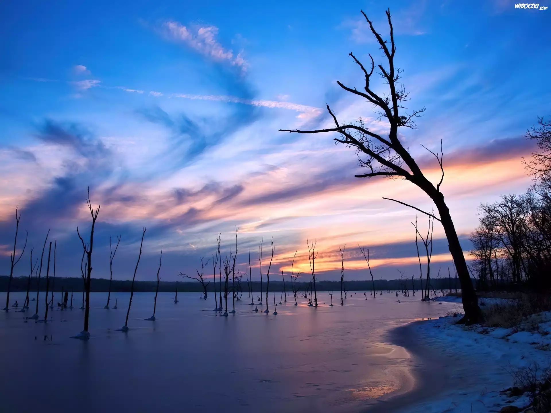Drzewa, Śnieg, Zamarznięte, Jezioro