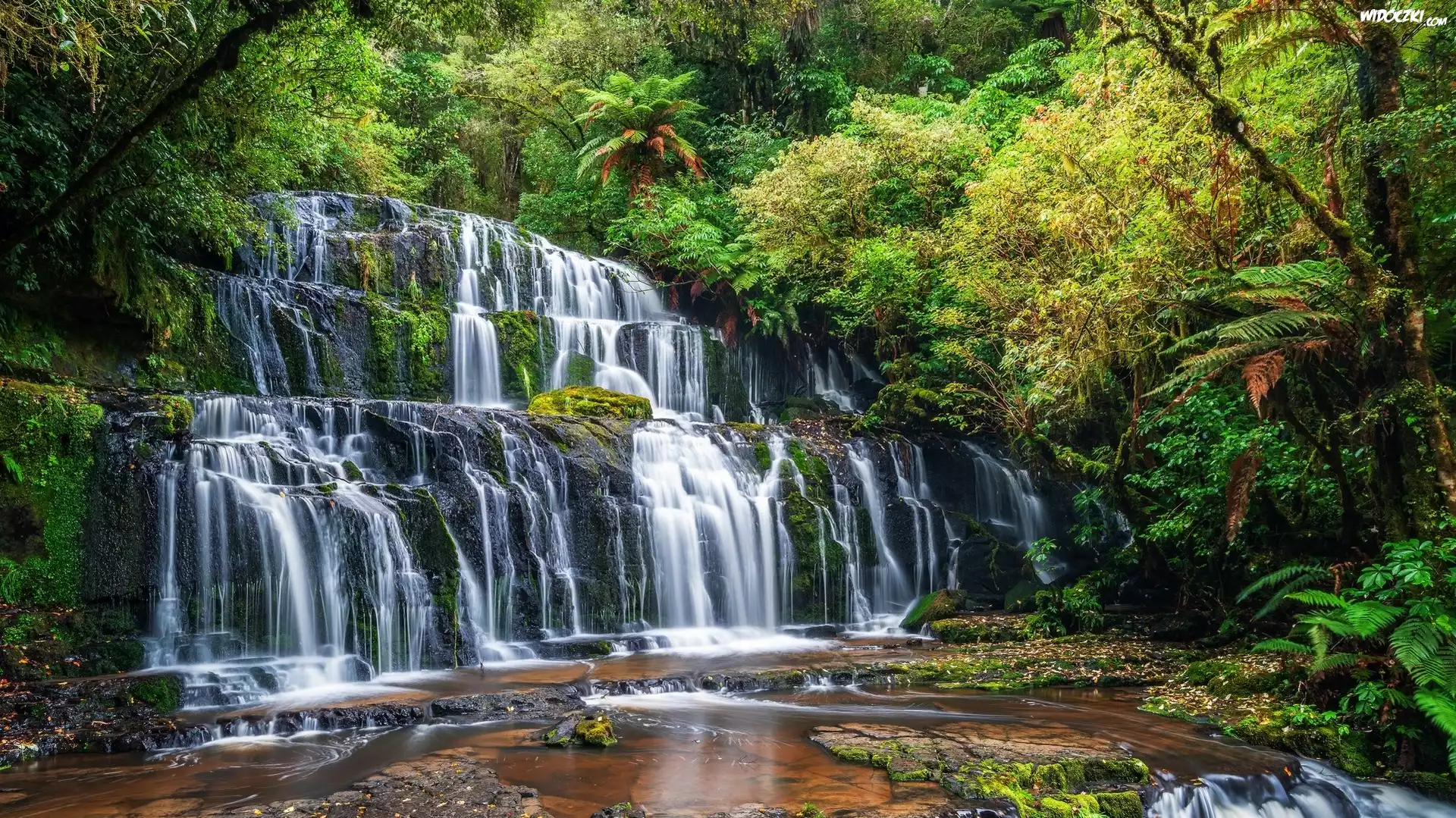 Zdjęcia, Wodospad, Purakaunui Falls, Skały, Rzeka, Las, Drzewa, Zielone, Rośliny, Nowa Zelandia