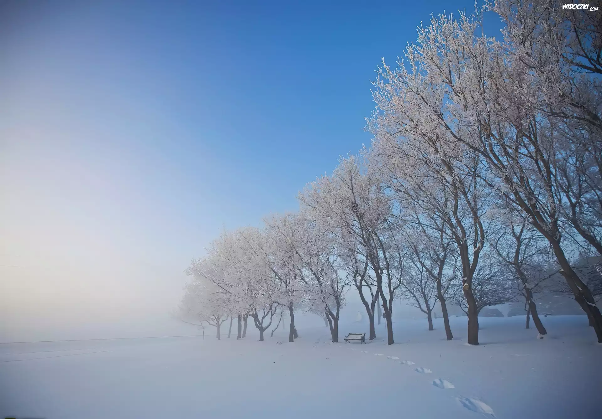 Zdjęcia, Zima, Drzewa, Ławka