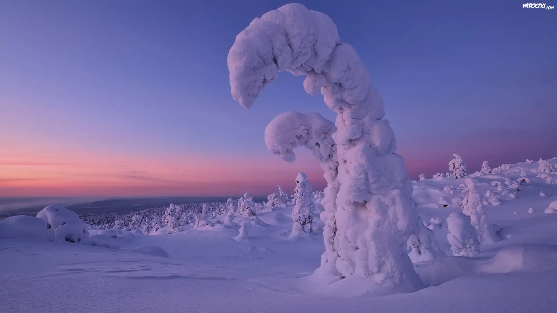 Zima, Drzewa, Pochylone, Ośnieżone, Półwysep Kolski, Rosja