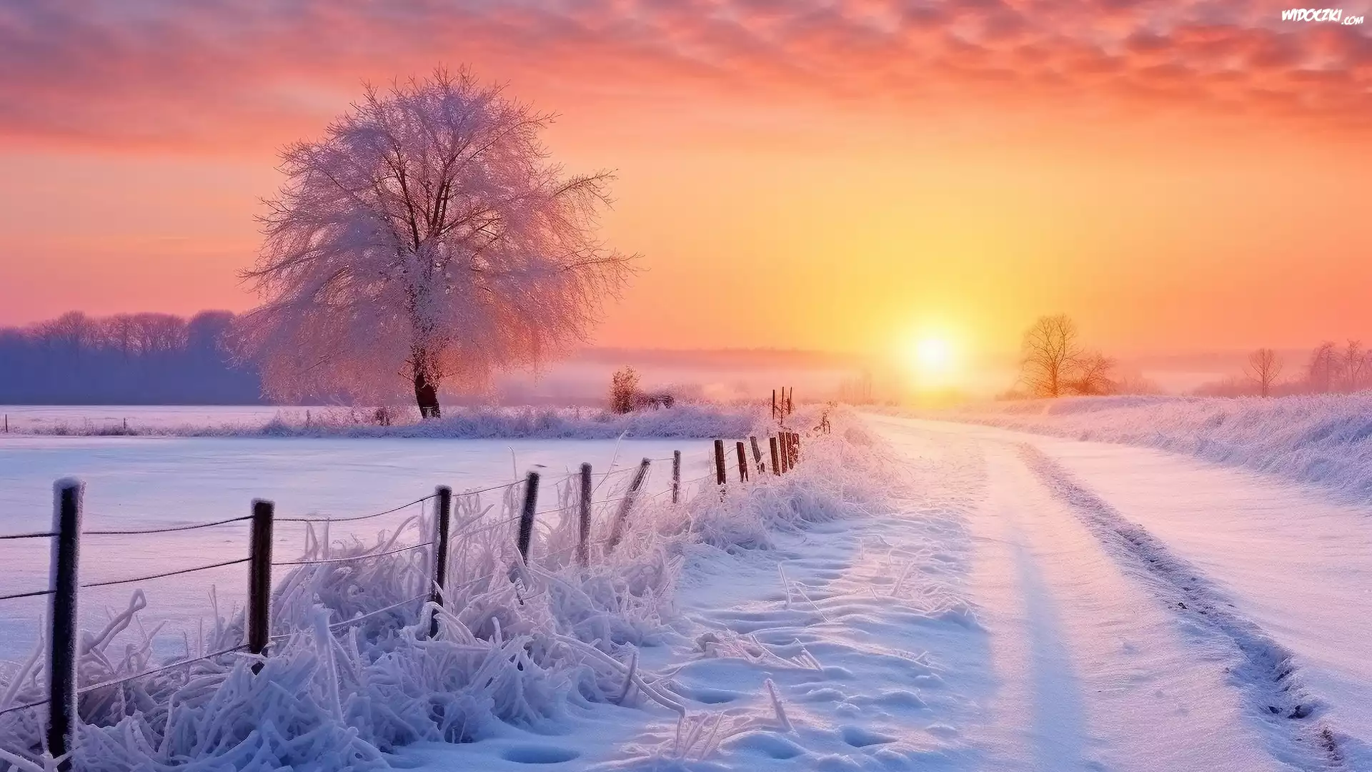 Wschód słońca, Zima, Drzewa, Droga, Ośnieżona, Ogrodzenie