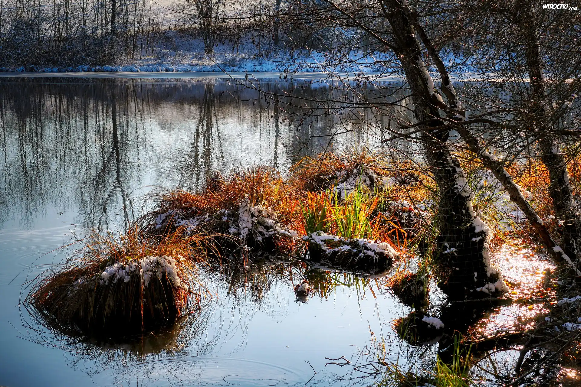 Zdj臋cia, Zima, Jezioro, Trawa, Drzewa
