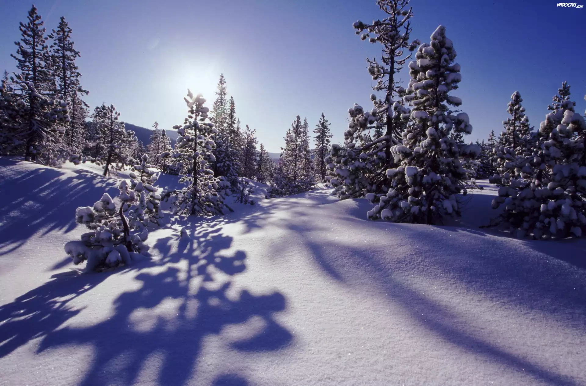 Zdjęcia, Drzewka, Pokryte, Śniegiem, Promienie, Słońca