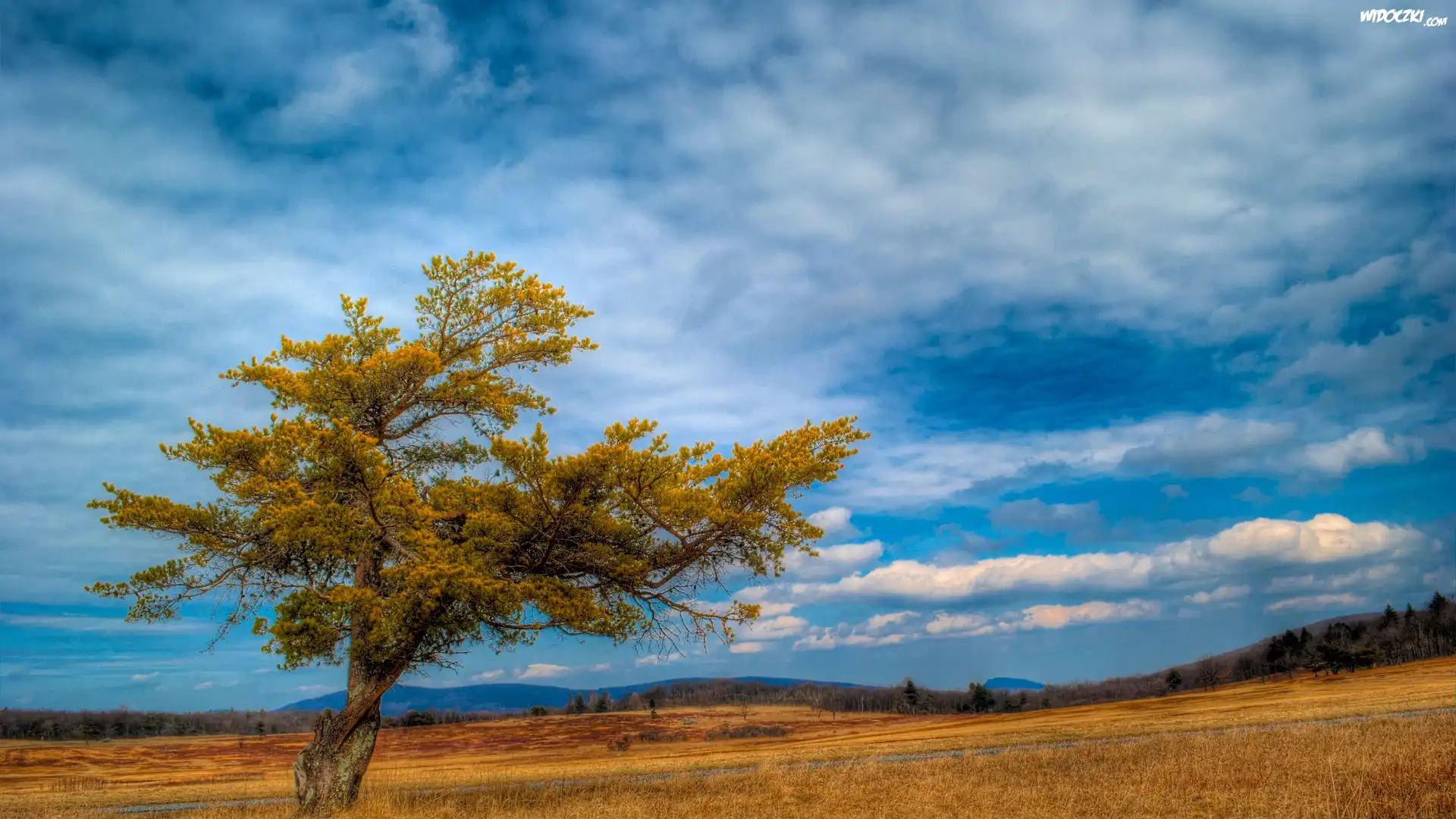 Drzewo, Łąki, Góry, Chmury, Jesień