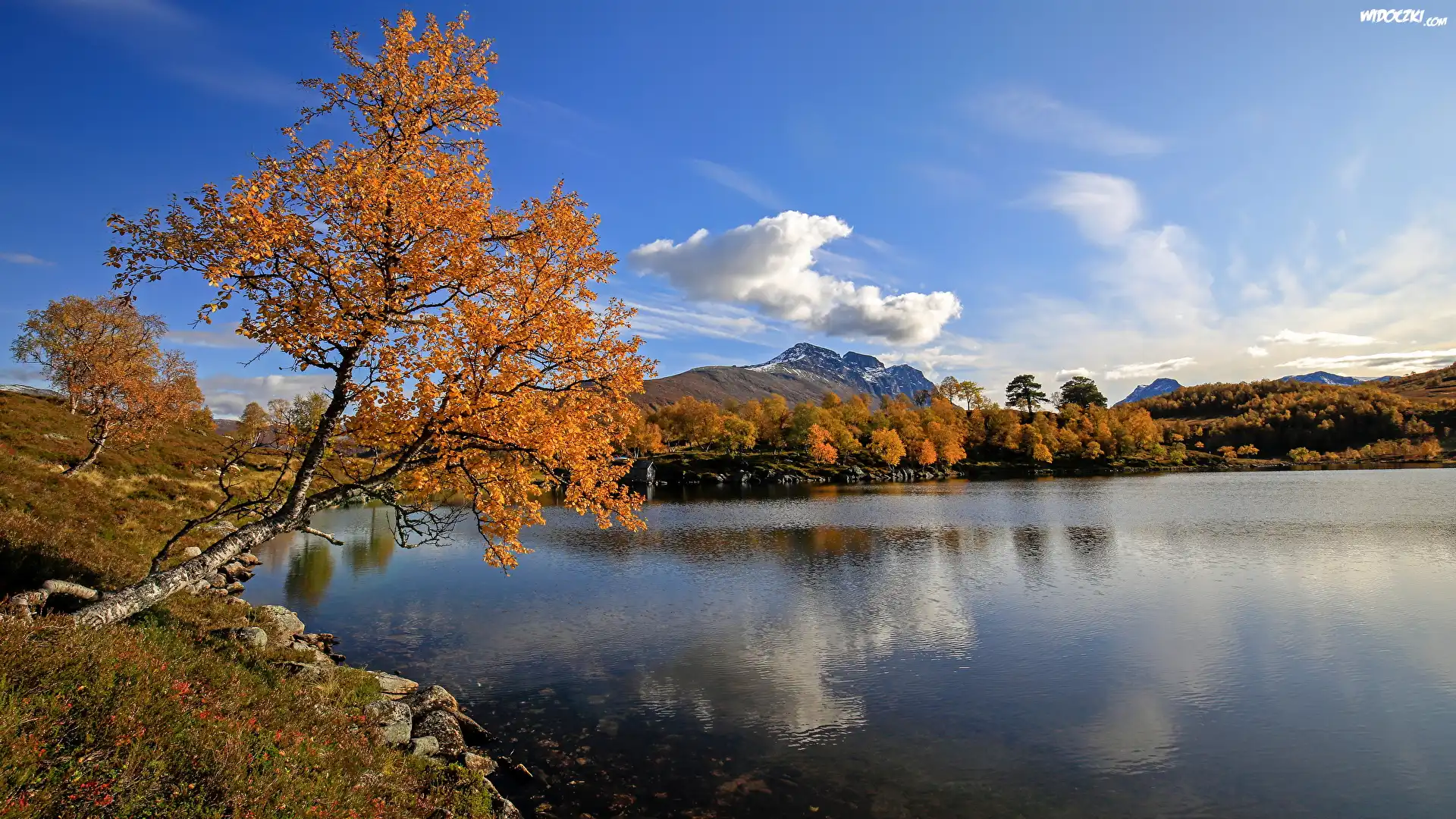 Drzewo, Jezioro, Góry, Chmury, Jesień