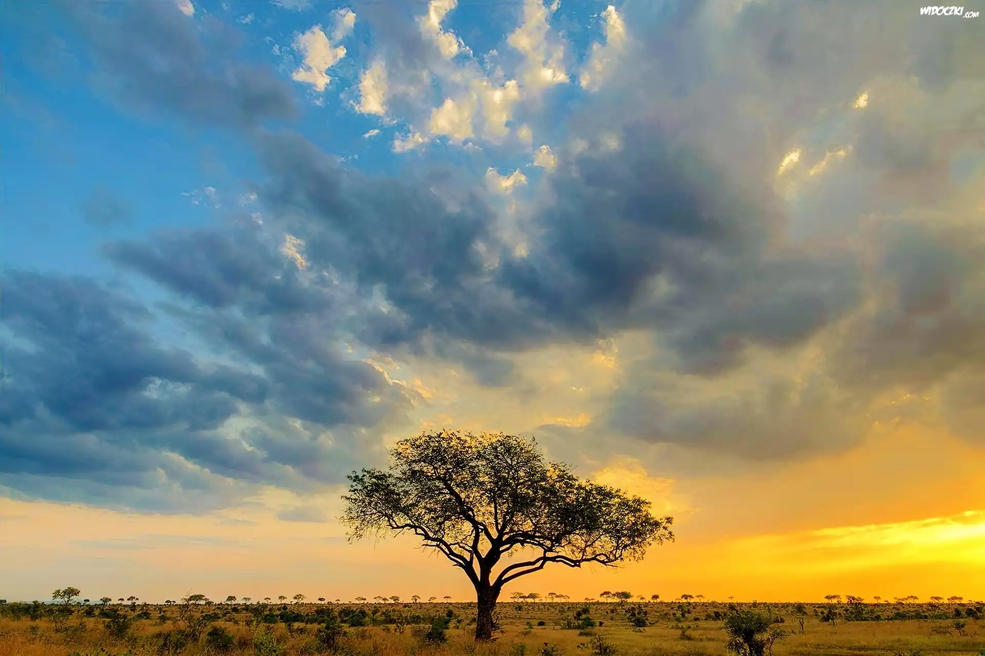 Drzewo, Zachód, Słońca, Chmury, Niebo