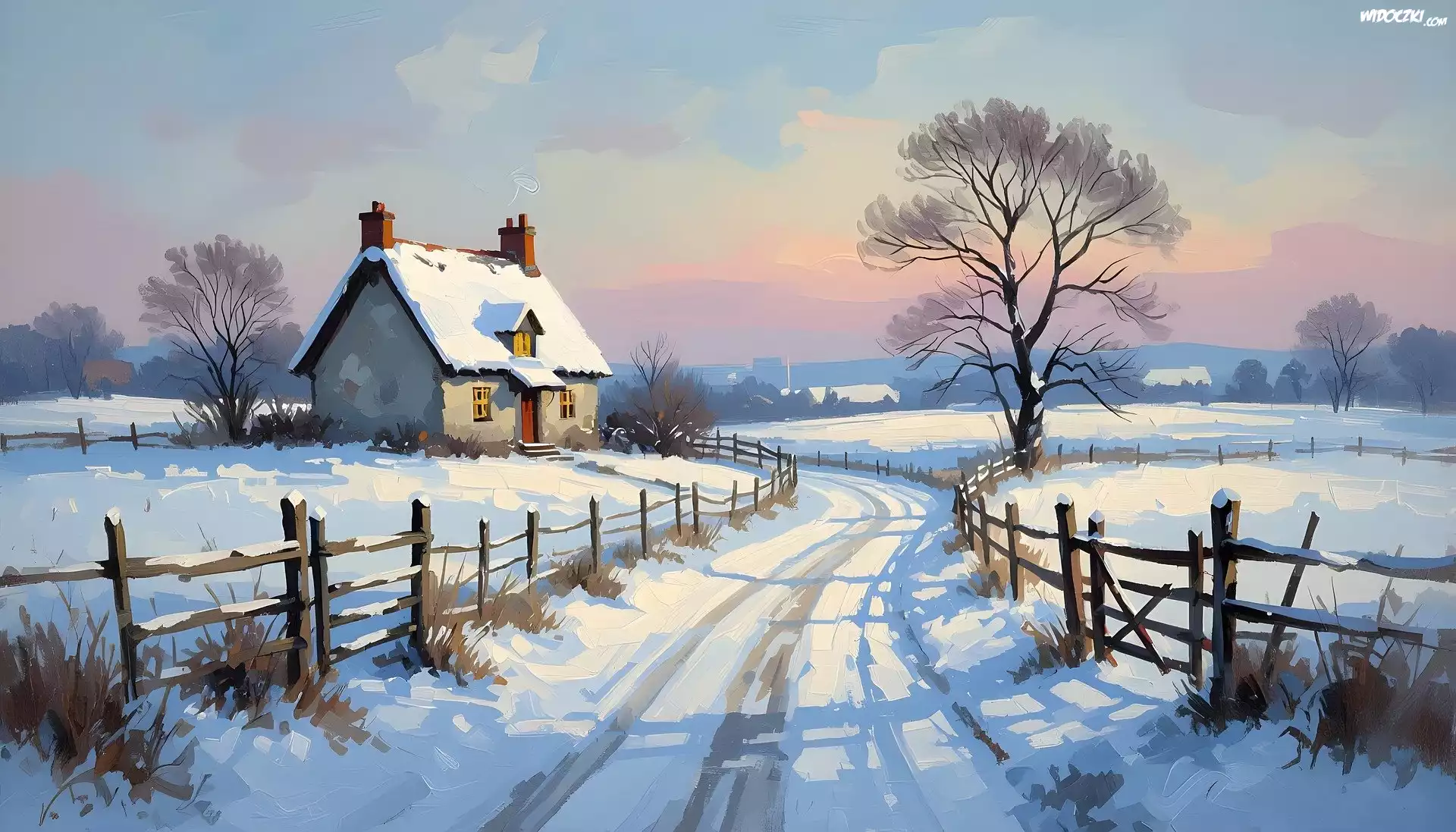 Zima, Drzewo, Dom, Ogrodzenie, Droga