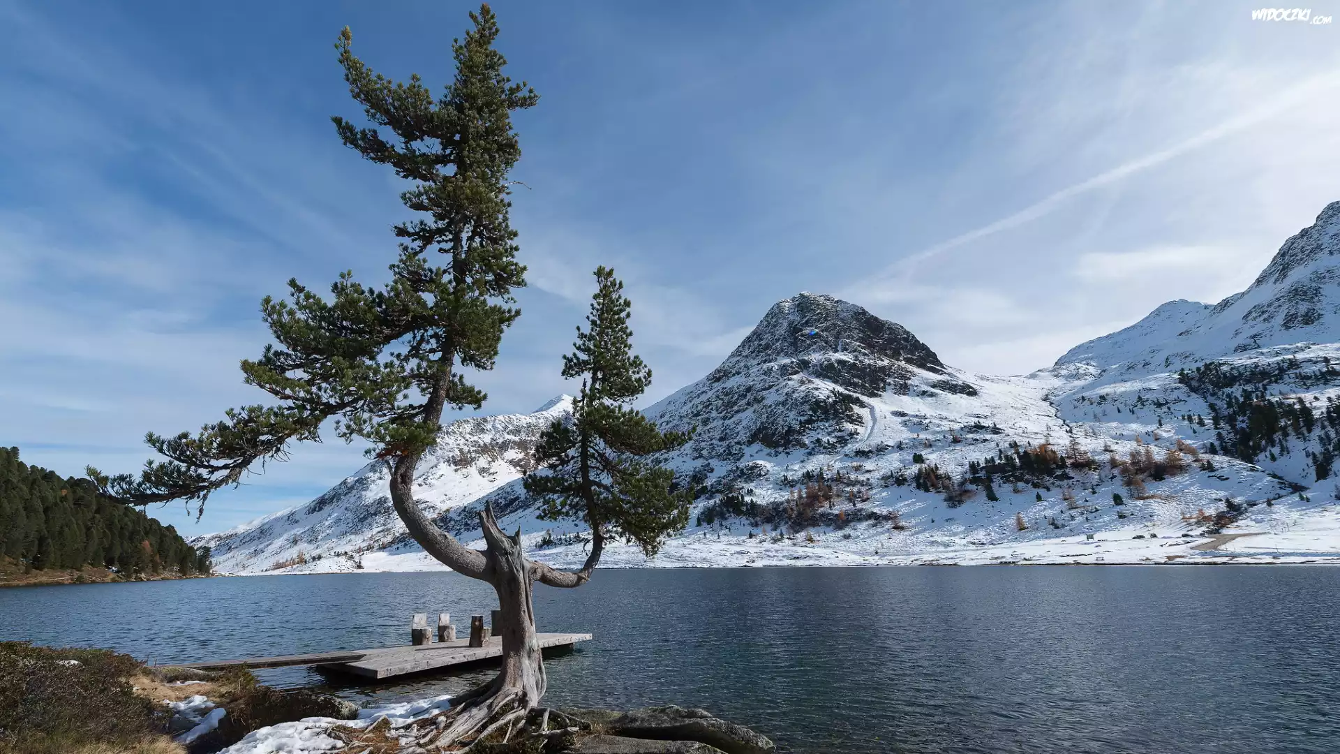 Drzewo, Sosna, Ośnieżone, Góry, Alpy, Jezioro, Obersee, Pomost, Park Narodowy Berchtesgaden, Bawaria, Niemcy |