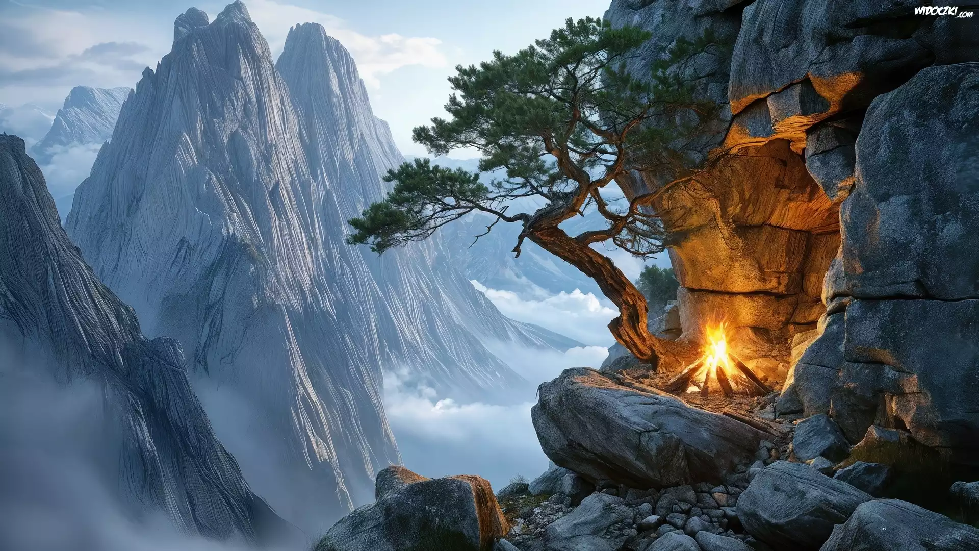 Zdjęcia, Jaskinia, Ognisko, Skały, Drzewo, Góry, Grafika
