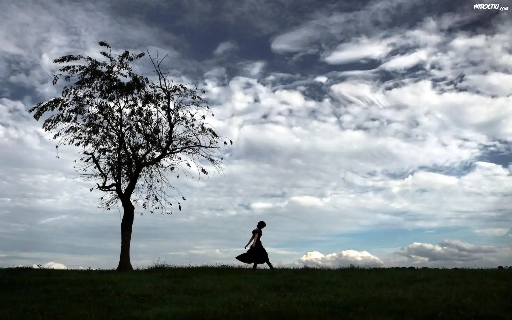 Zdjęcia, Łąka, Kobieta, Drzewo, Chmury