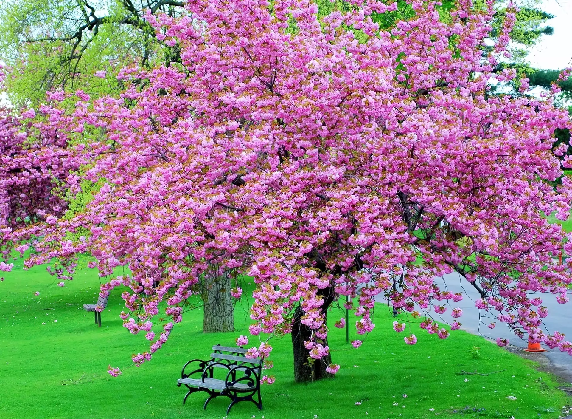 Zdjęcia, Kwitnące, Drzewo, Ławka