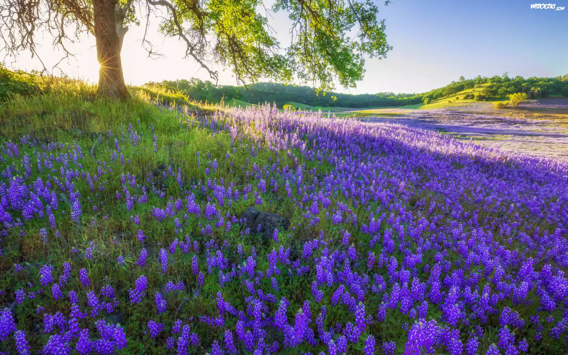 Zdjęcia, Łąka, Kwiaty, Łubin, Drzewo