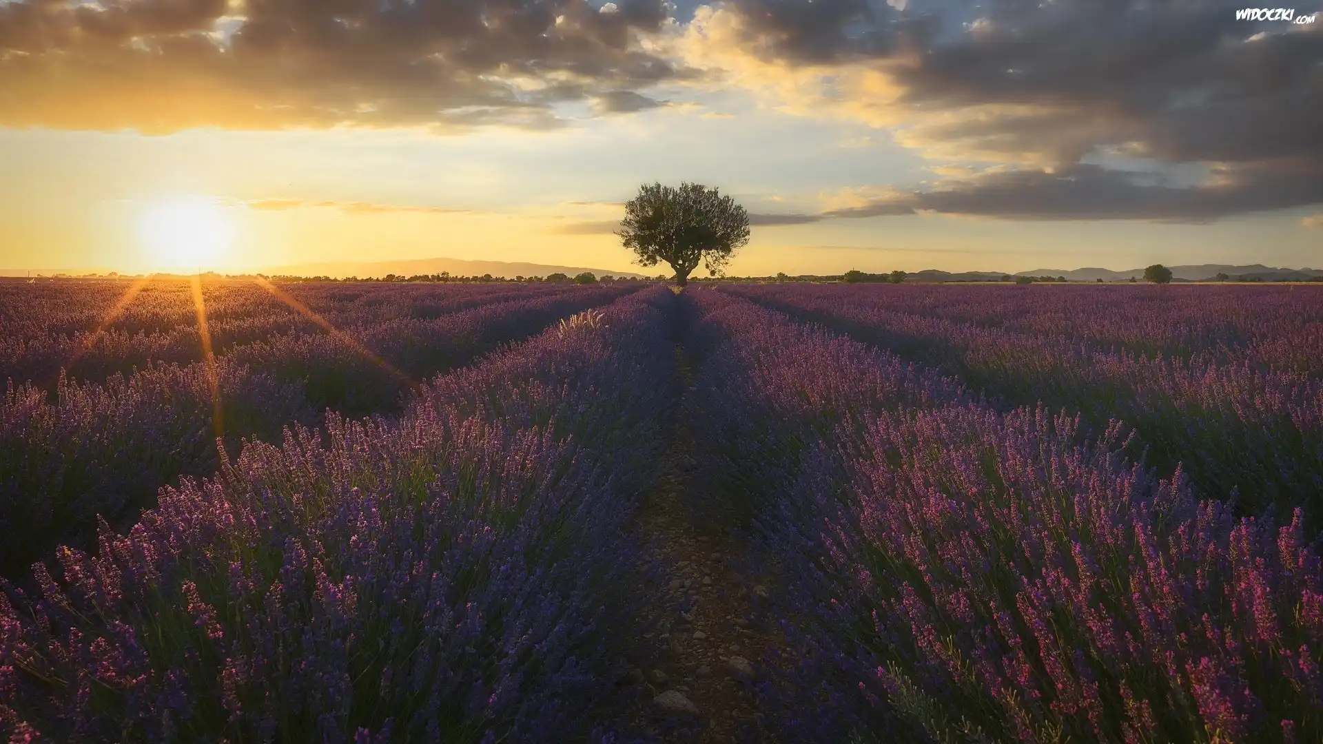 Zdjęcia, Pole, Kwiaty, Lawenda, Drzewo, Chmury, Promienie słońca