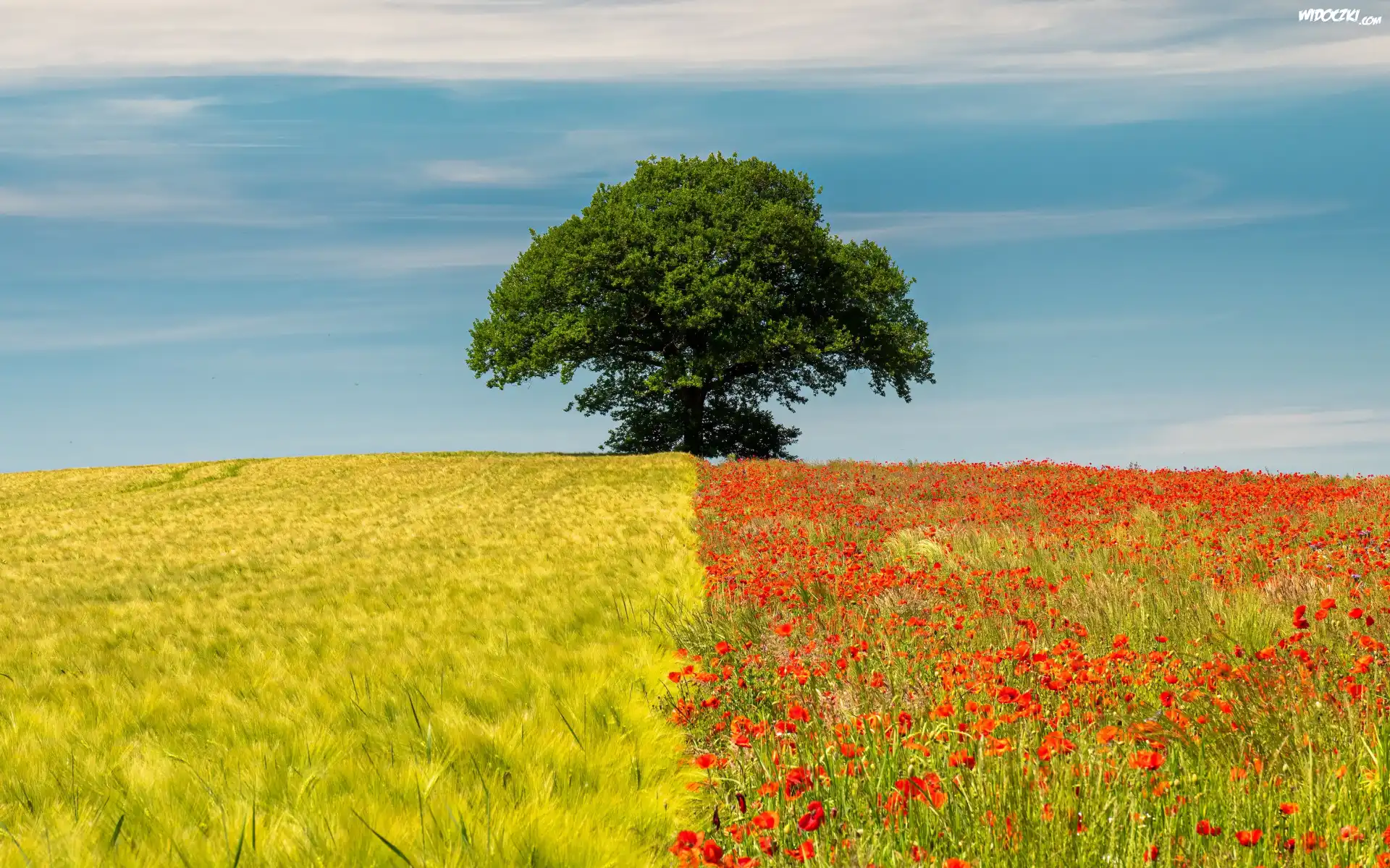 Zdjęcia, Drzewo, Pole, Maki, Zboże