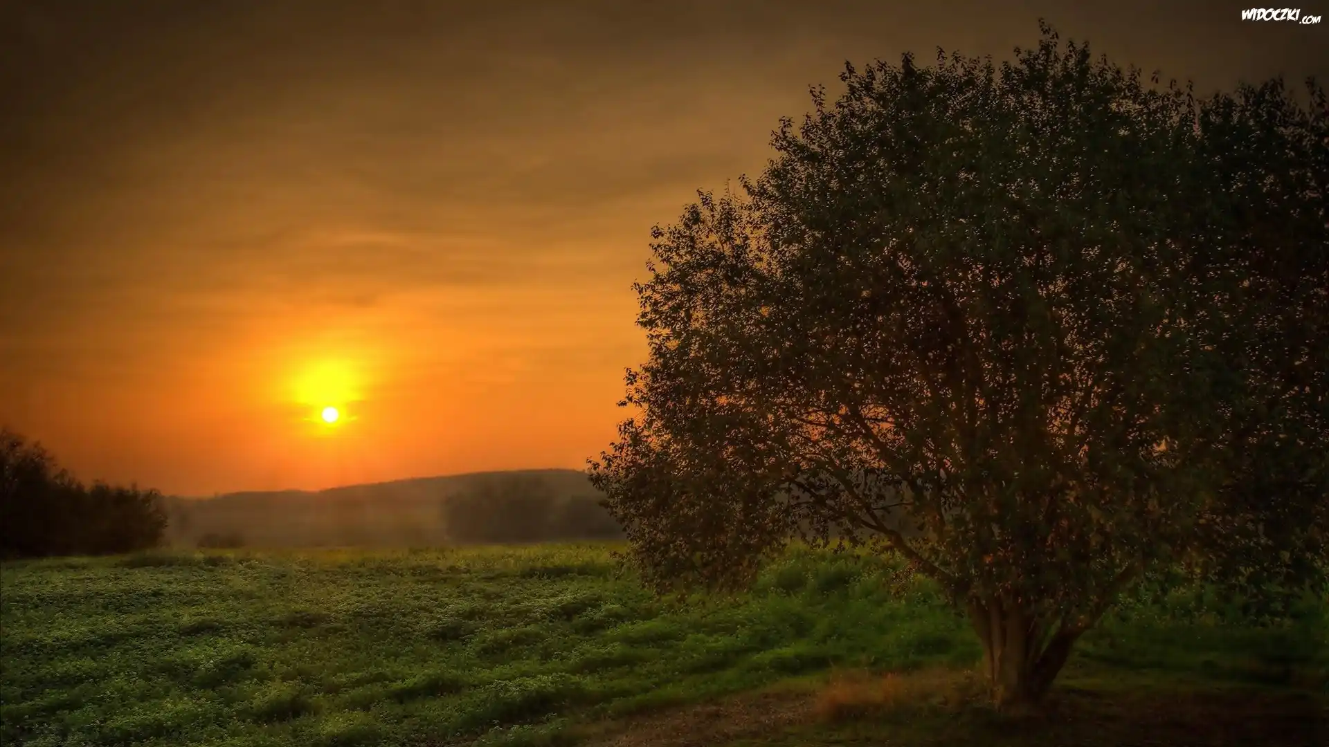 Zdjęcia, Drzewo, Zachód słońca, Mgła, Łąka