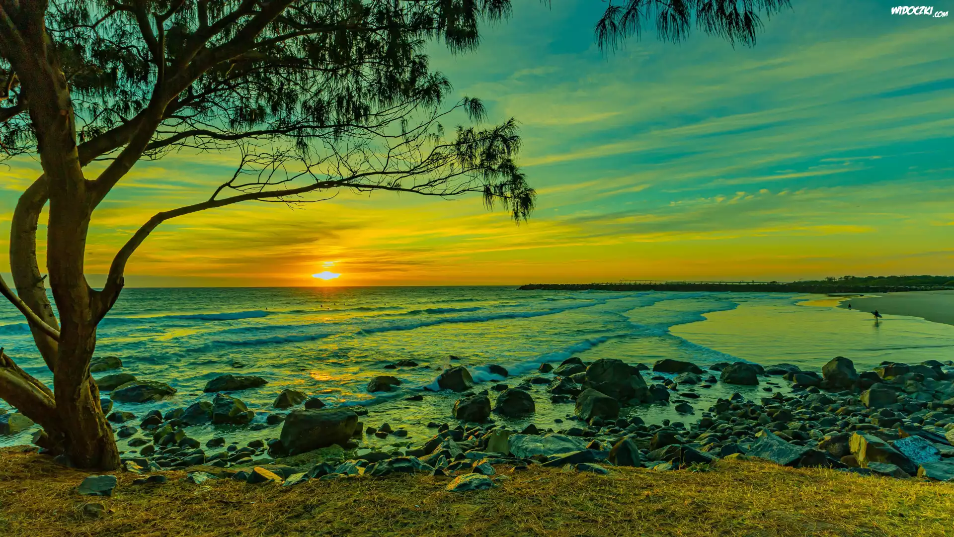 Plaża, Zachód Słońca, Drzewo, Chmury, Morze