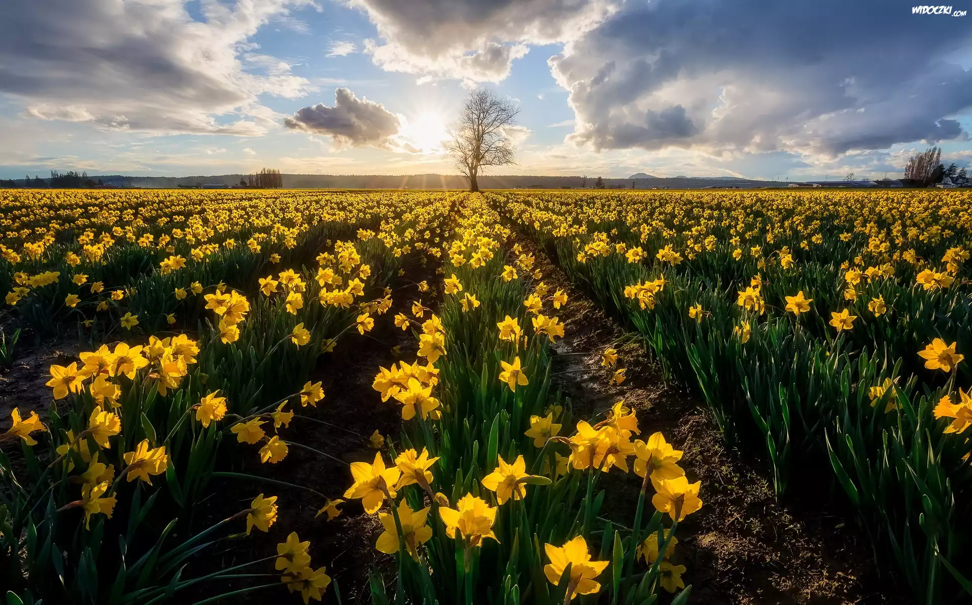 Zdjęcia, Wiosna, Pole, Narcyzy żonkile, Niebo, Chmury, Promienie słońca, Drzewo